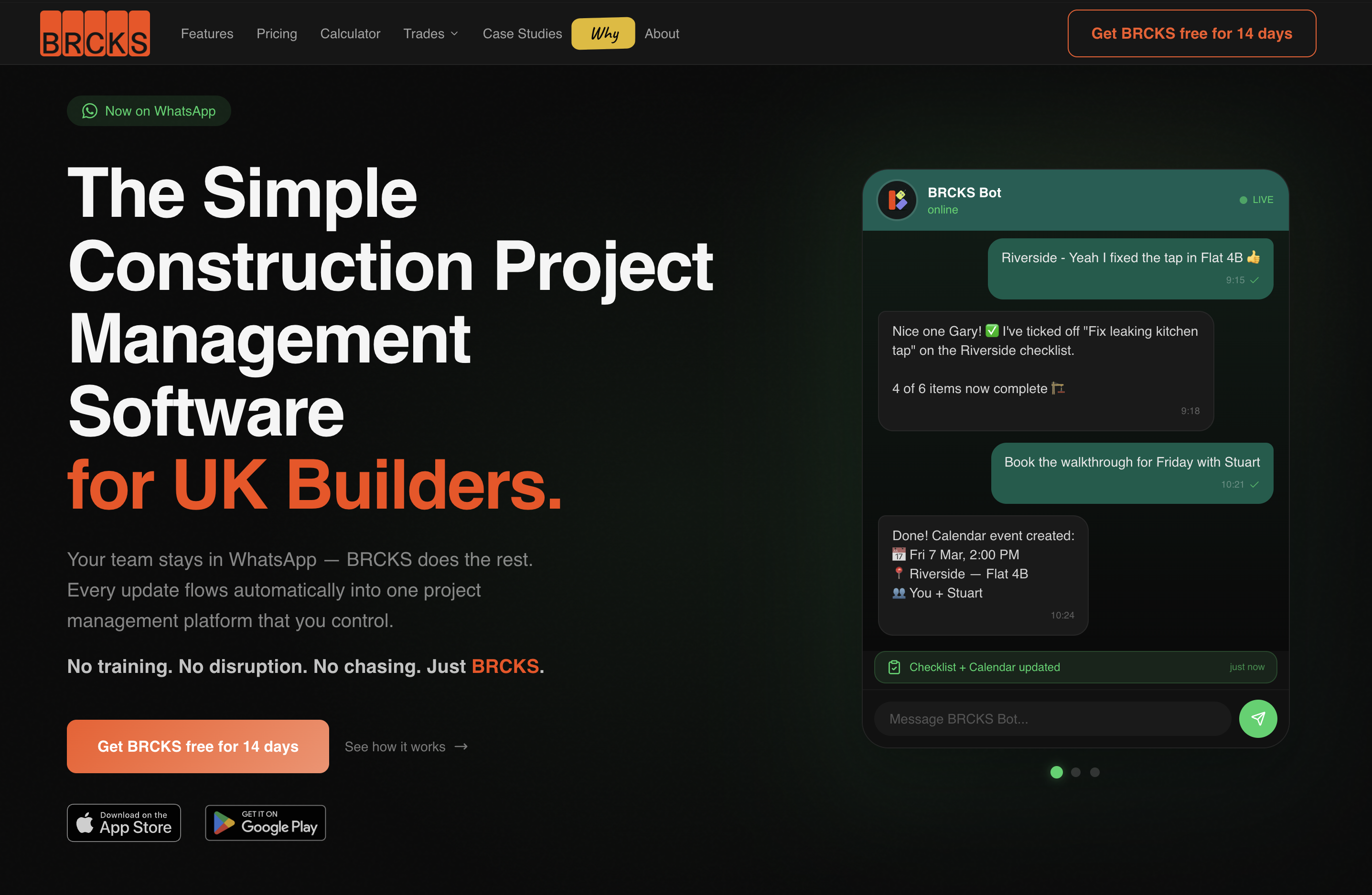 BRCKS is a simple, powerful construction project management software built specifically for UK builders and construction teams. Designed by industry veterans with over 20 years of on-site experience, BRCKS eliminates the chaos of scattered communication by centralizing project updates, tasks, and files into one intuitive platform.