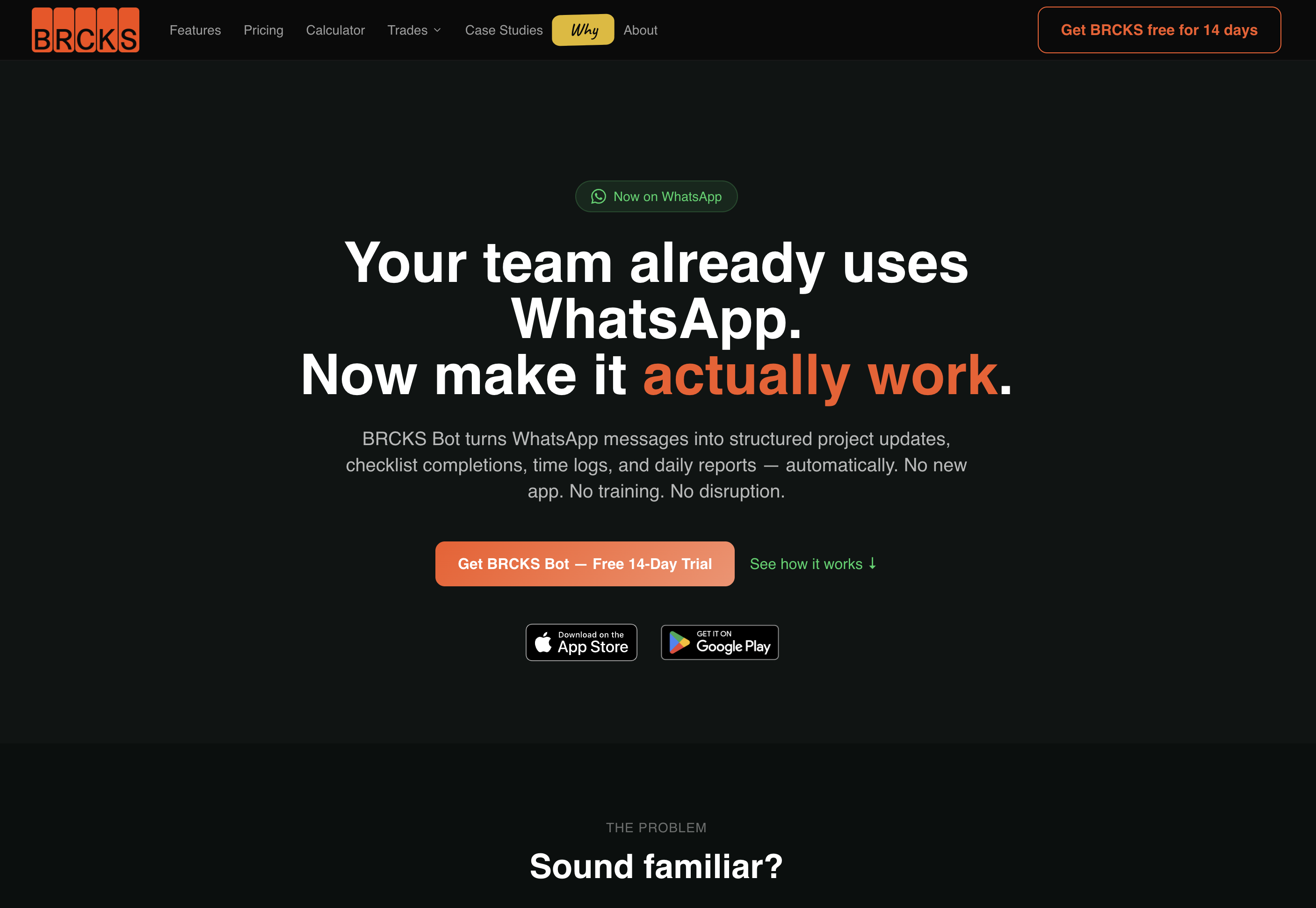 The core differentiator of BRCKS is its seamless integration with the tools construction teams already use. Recognizing that tradespeople rely heavily on WhatsApp, BRCKS allows teams to stay in their preferred messaging apps while the platform automatically captures and organizes every update. Through the innovative BRCKS Bot, users can update projects, check tasks, and get instant answers via WhatsApp or Telegram messages, ensuring no disruption to existing workflows and requiring zero training.