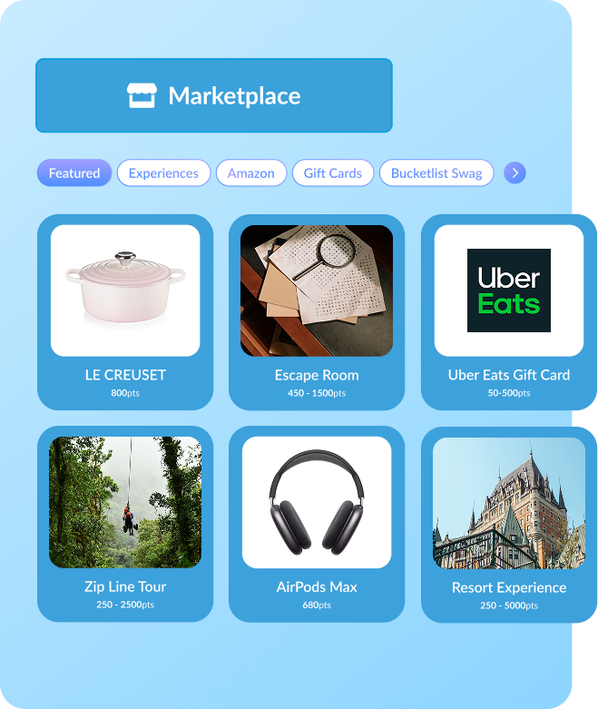 Global rewards marketplace with gift cards, experiences, merchandise, and charity options