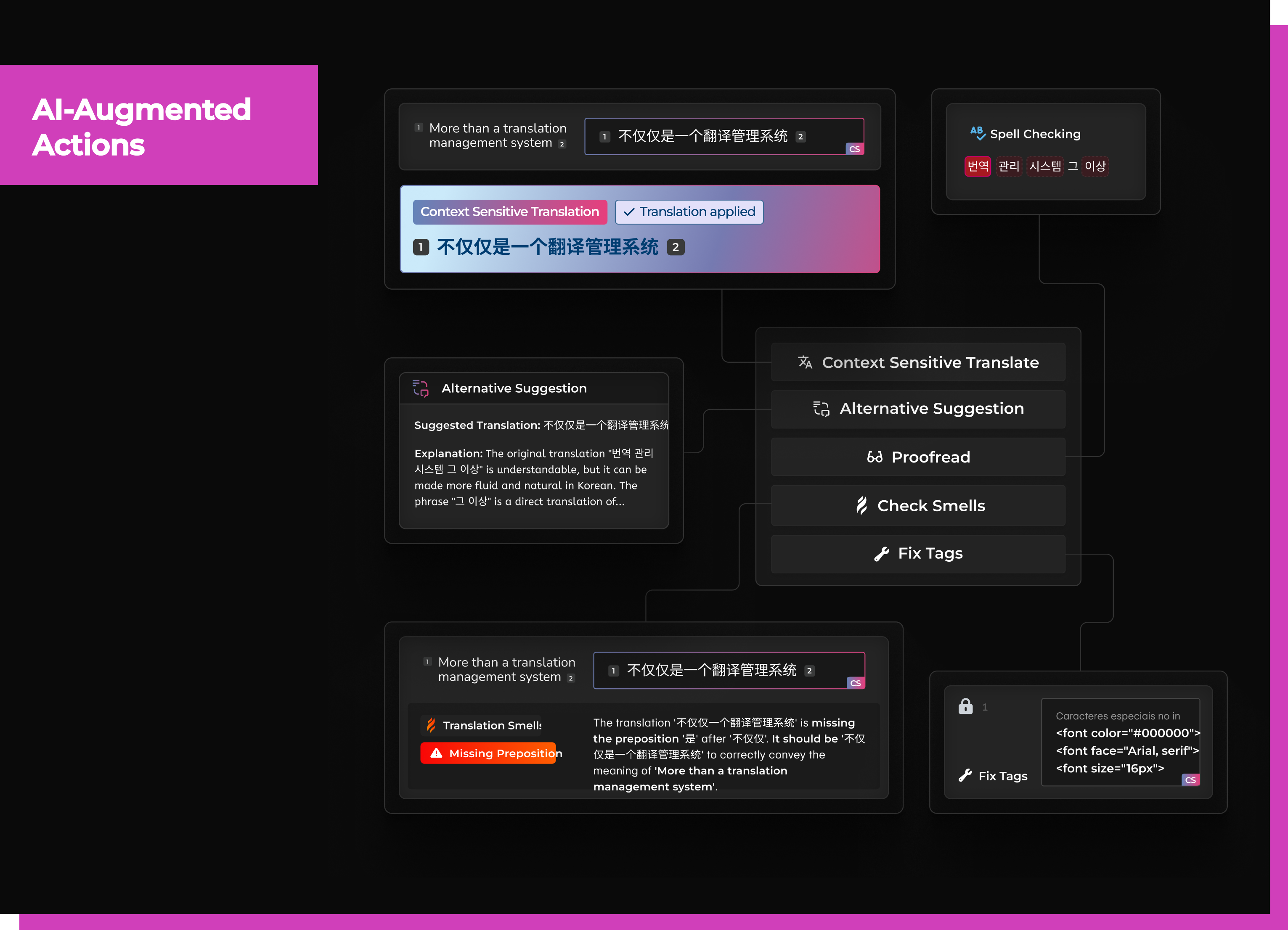 - Smells: Automatically detect and correct contextual translation errors.