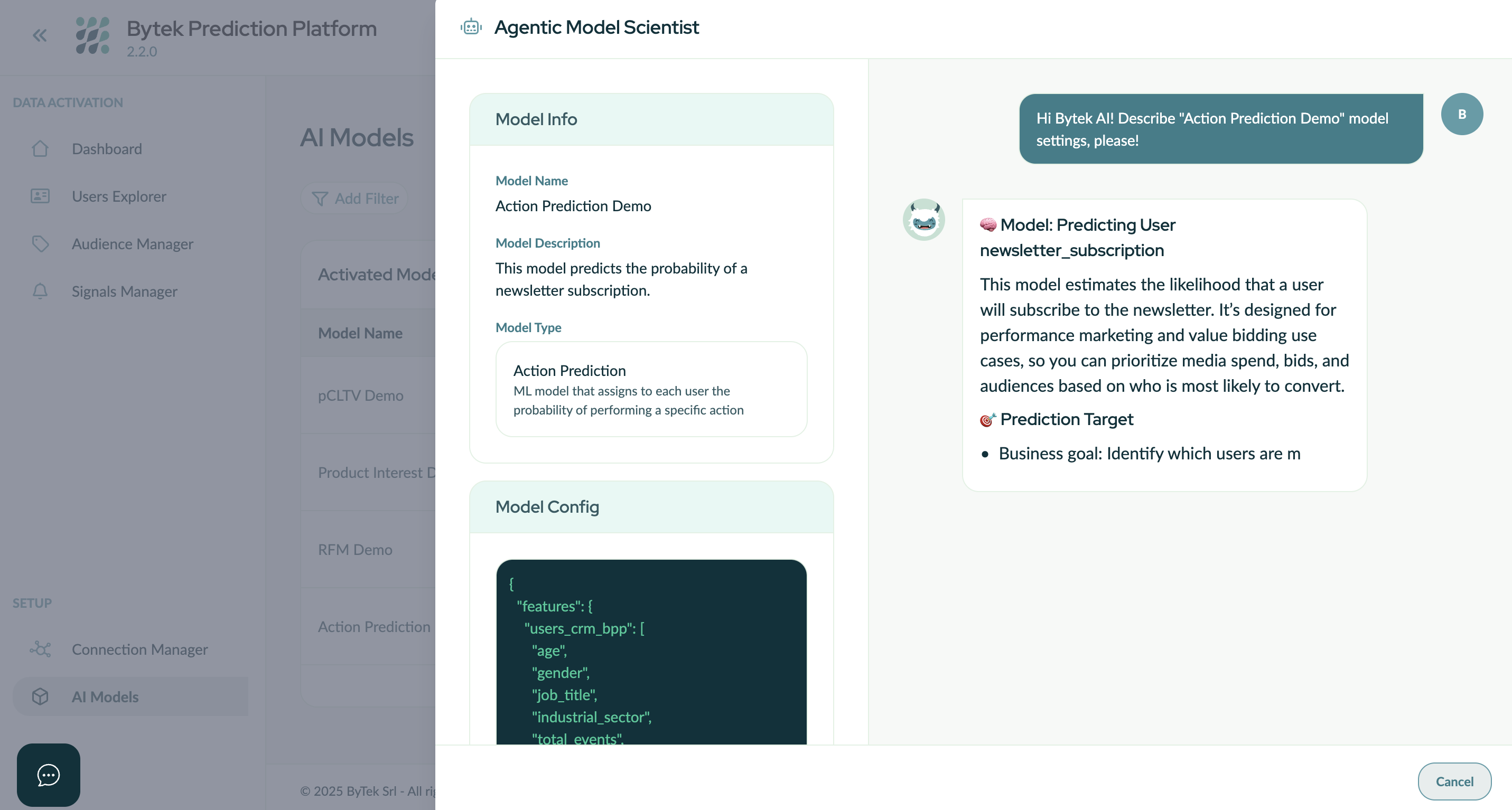 - AI Models generate predictive and descriptive analytics tailored to business outcomes. These include Action Prediction (likelihood of conversion), product and interest clustering, Recency-Frequency-Monetary (RFM) analysis, Lead Scoring, and predicted Customer Lifetime Value (pcLTV). Each model is customizable, trained on client-specific data, and supports continuous learning.