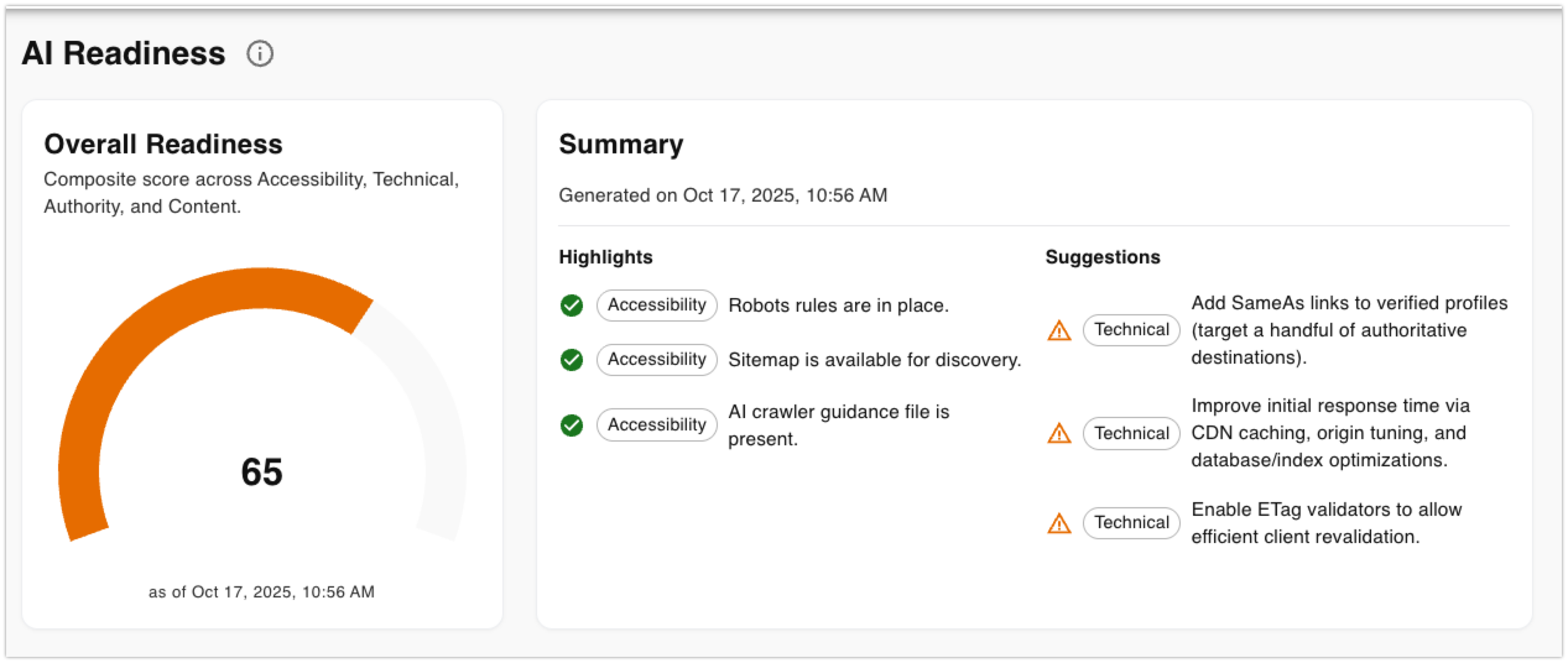 Cairrot's AI Readiness feature scans your website and provides a score assessing how optimized your brand is for AI search. Cairrot examines your website for thousands of potential LLM ranking factors and gives you your top optimizations to prioritize. Cairrot takes the guesswork out of AI SEO, j...