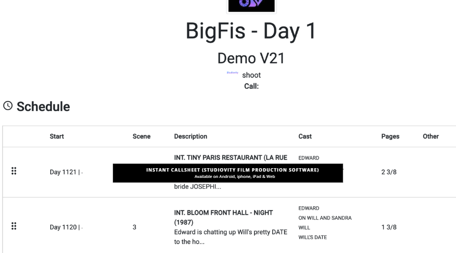 Studiovity's call sheets are designed to be both comprehensive and highly customizable for professional sets: