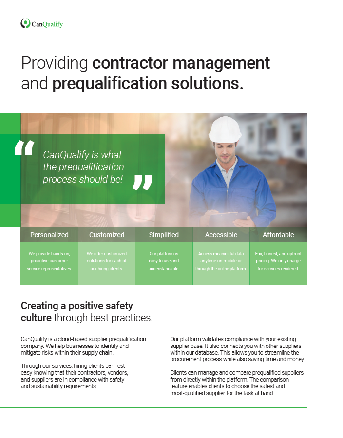 CanQualify has always been a great source that made the job of our company easier in terms of supplier prequalification. It enables you to conveniently gather and store supplier records of safety standards and insurance data efficiently. Review collected by and hosted on G2.com.