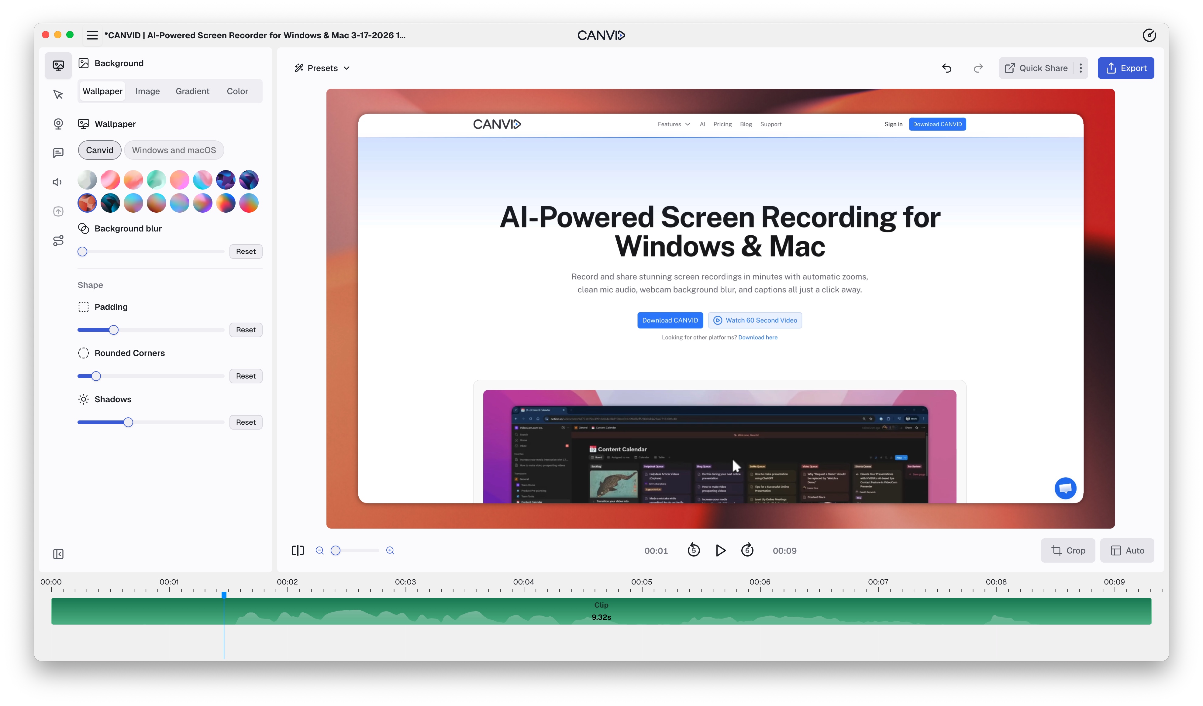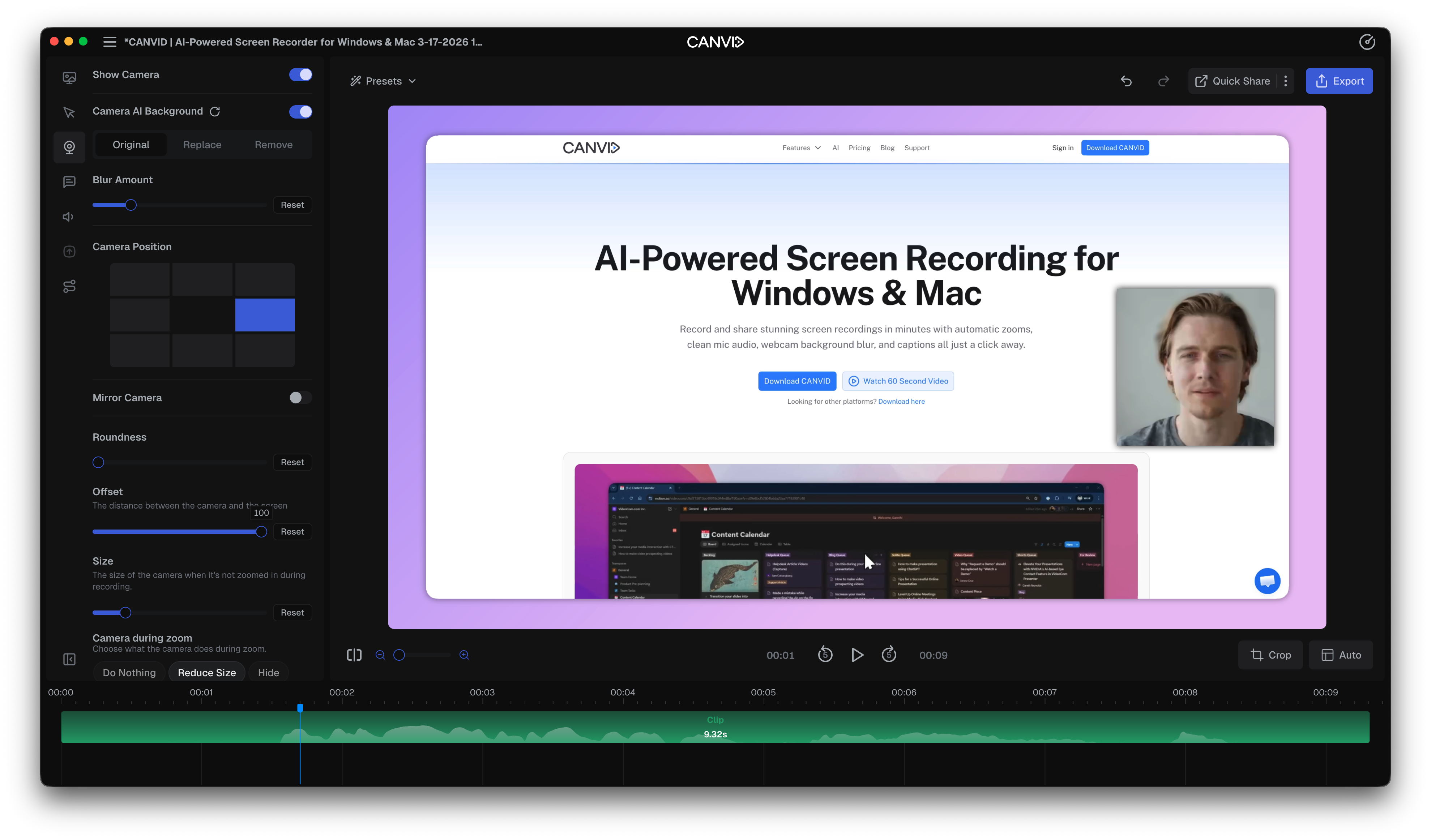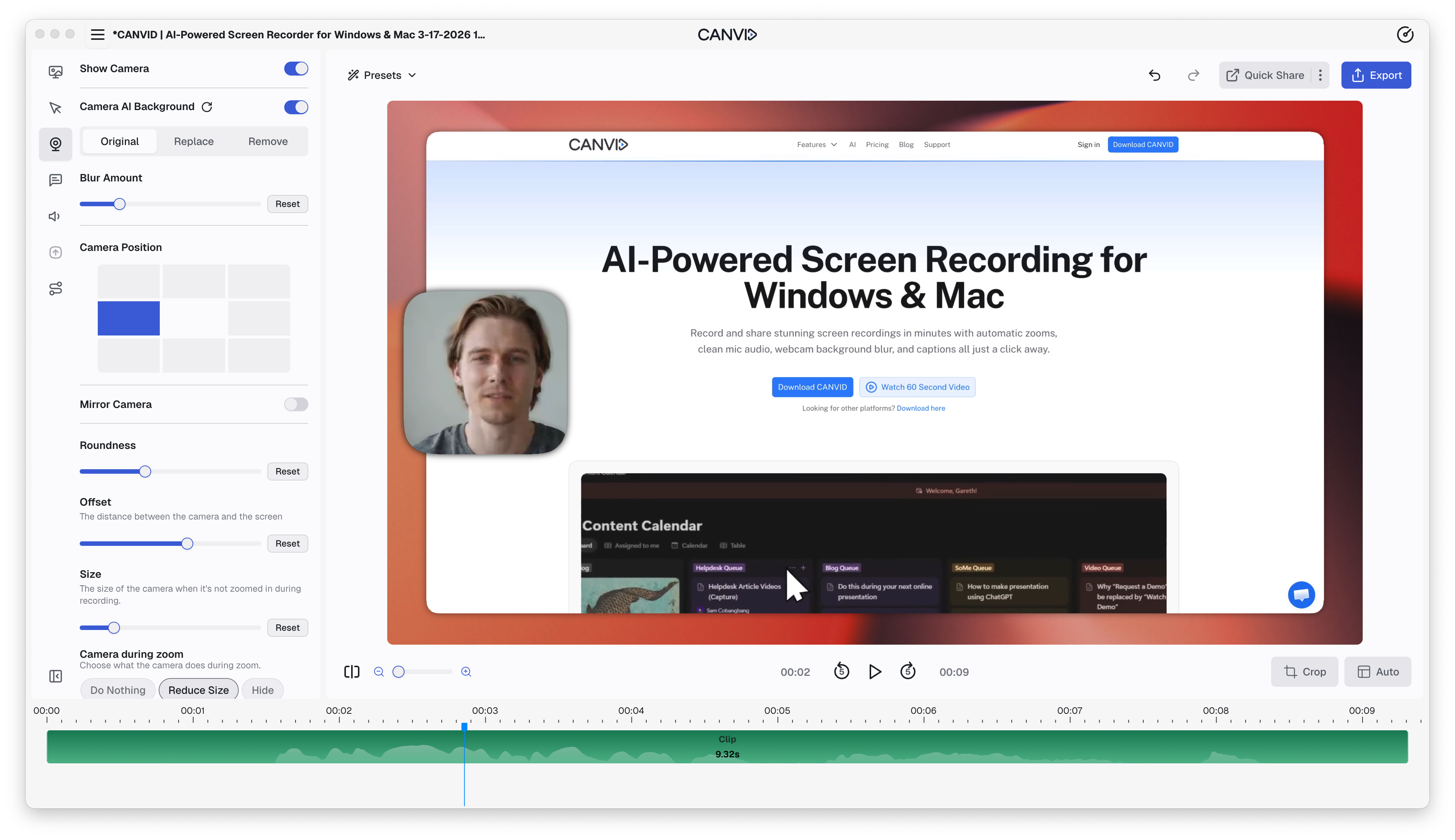 CANVID also includes tools that improve the quality of recorded audio and video. Built-in noise reduction helps clean up microphone recordings, while webcam features allow users to include their face in the video with background blur or other visual effects. Automatic captions and transcripts can also be generated to make videos easier to follow and accessible to a wider audience.