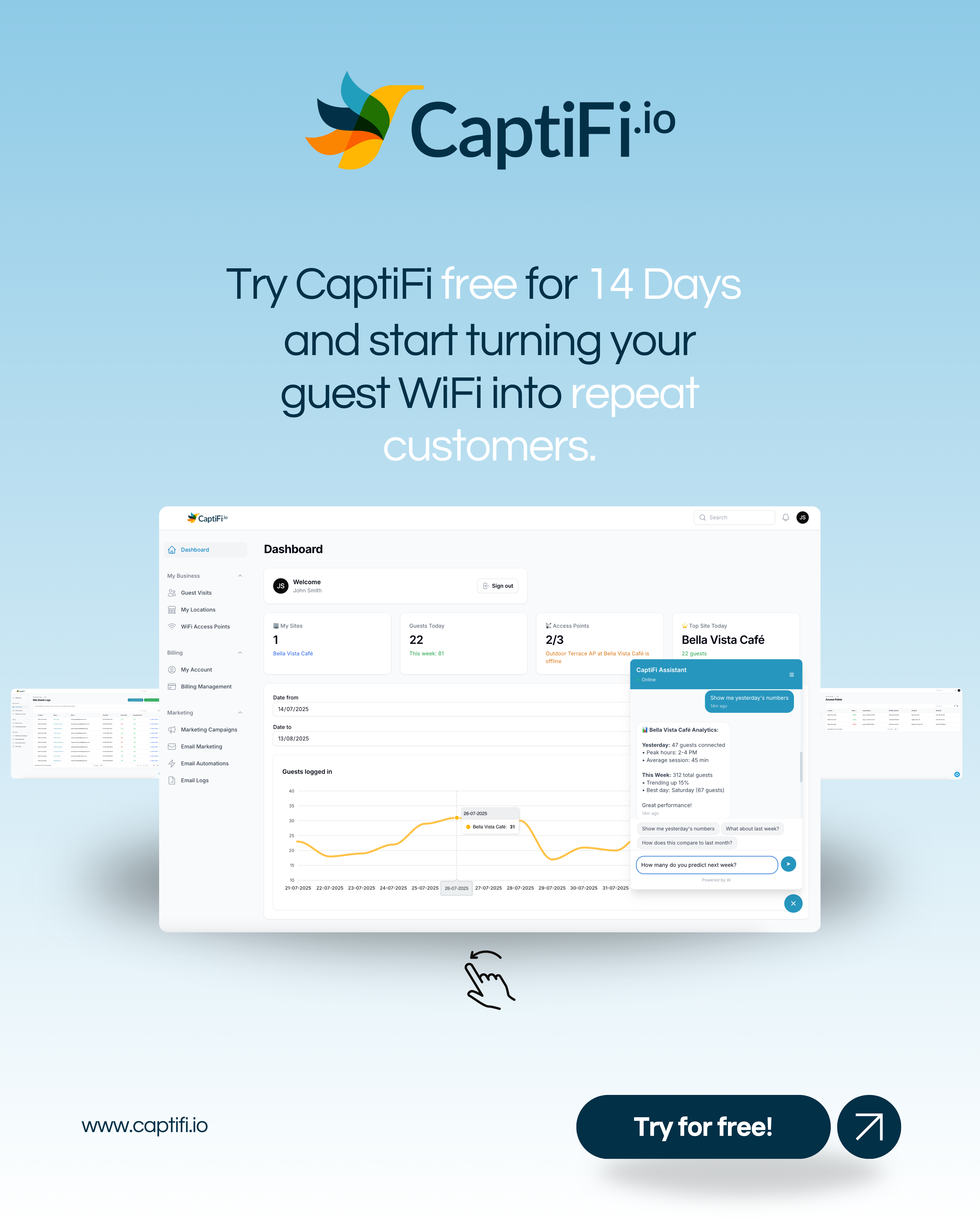 CaptiFi is a plug-and-play guest WiFi marketing platform designed for hospitality venues, Airbnbs, cafés, bars, and leisure spaces. It connects to an existing internet network and transforms guest WiFi into a powerful marketing and data capture tool.