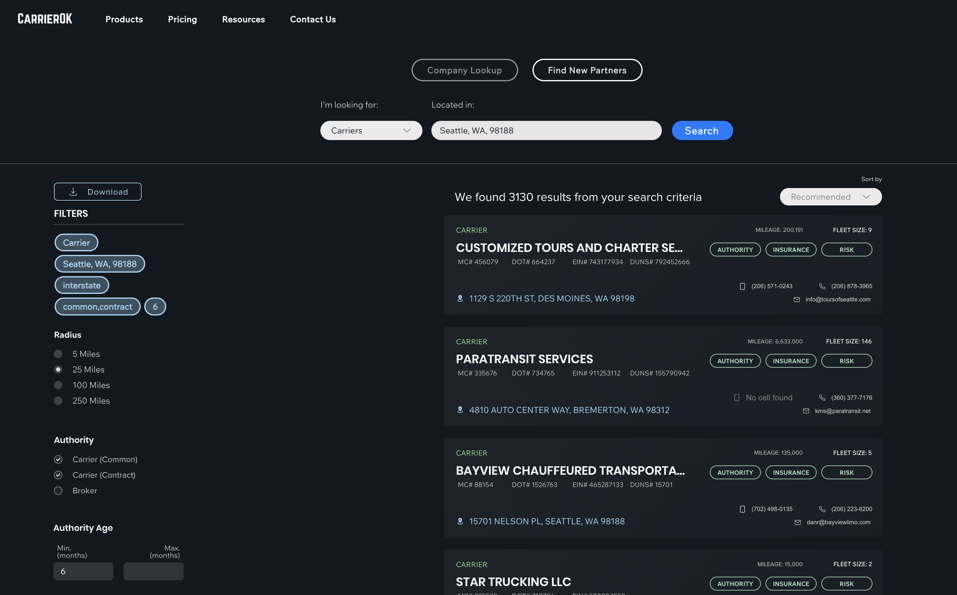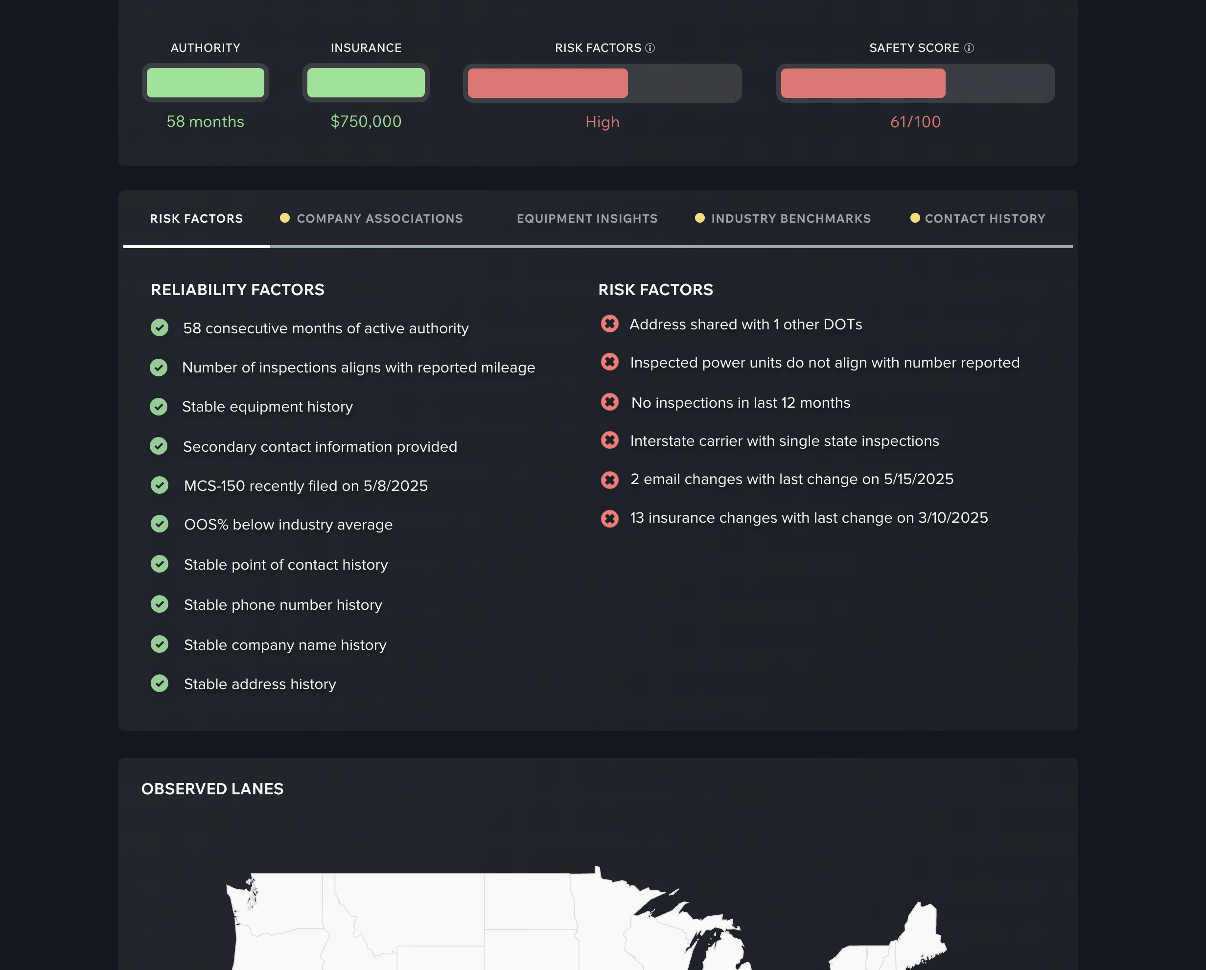 The platform delivers structured, real-time data on motor carriers, including authority status, insurance coverage, safety records, crash history, contact information, and operational activity. By combining official FMCSA data with proprietary formatting, severity labeling, and change tracking, CarrierOk transforms raw filings into clear, actionable intelligence. This empowers underwriters to assess eligibility and quote faster, factoring firms to fund with greater confidence, and fleet sales teams to identify prospects aligned with their risk appetite and growth goals.