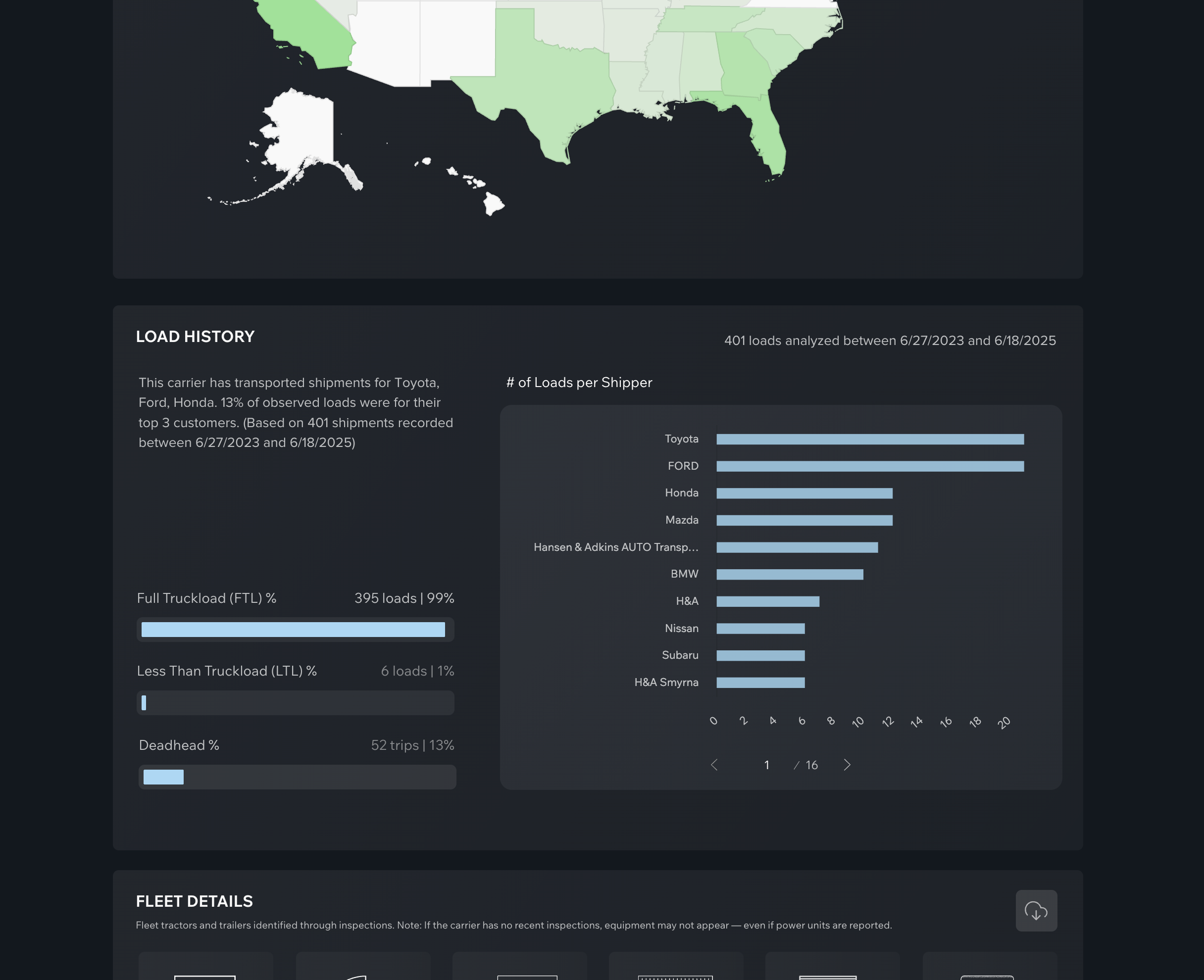 Beyond data delivery, CarrierOk provides dashboards and monitoring tools that give instant visibility into carrier activity. Users can filter by equipment type, fleet size, region, or change category, while a Chrome extension brings this intelligence into platforms like DAT and RMIS for in-workflow access.