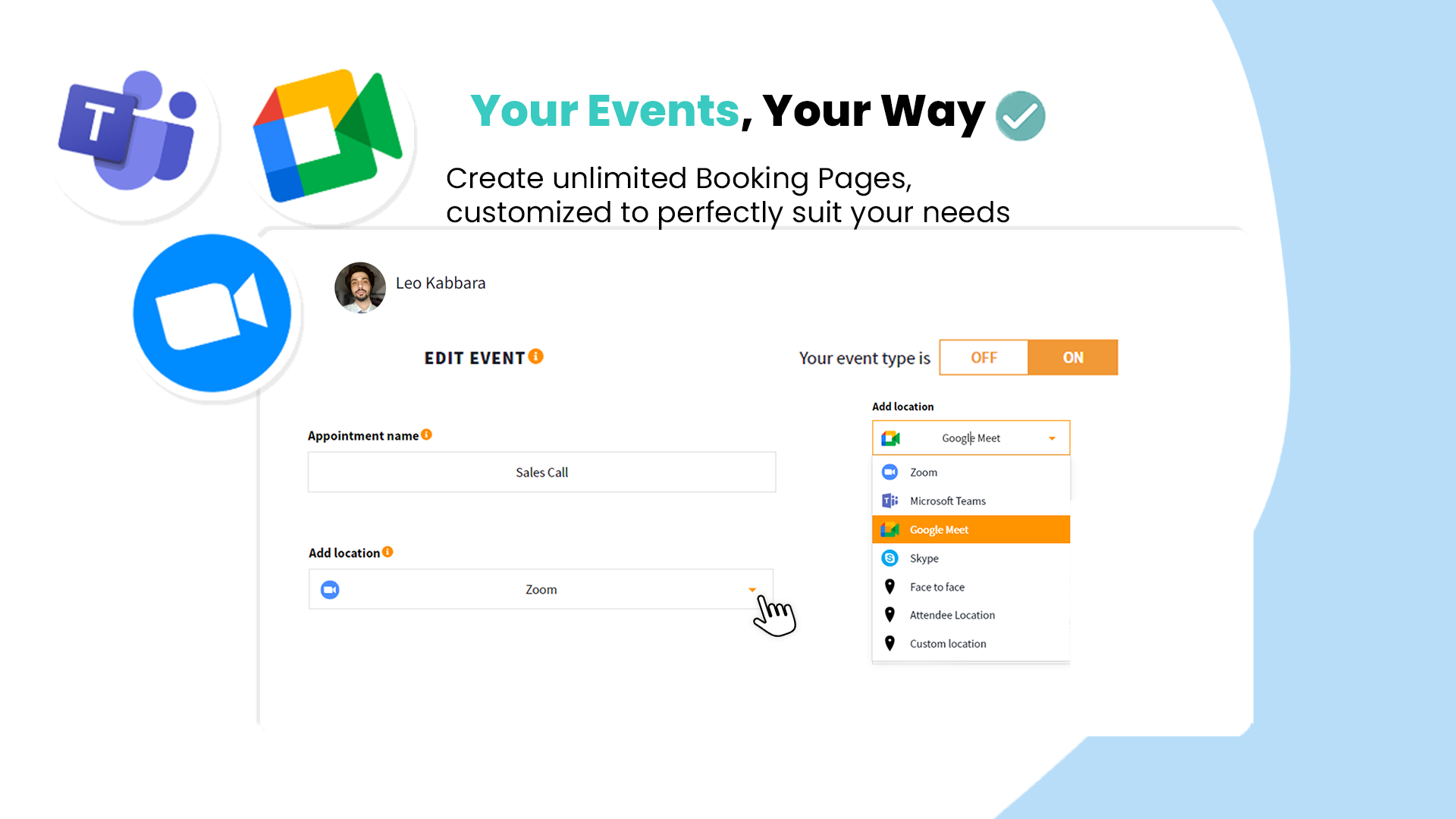 Customize your booking pages to allow your customers to choose when, where, and how to meet you while not conflicting with your existing commitments, with our fully customizable event types.