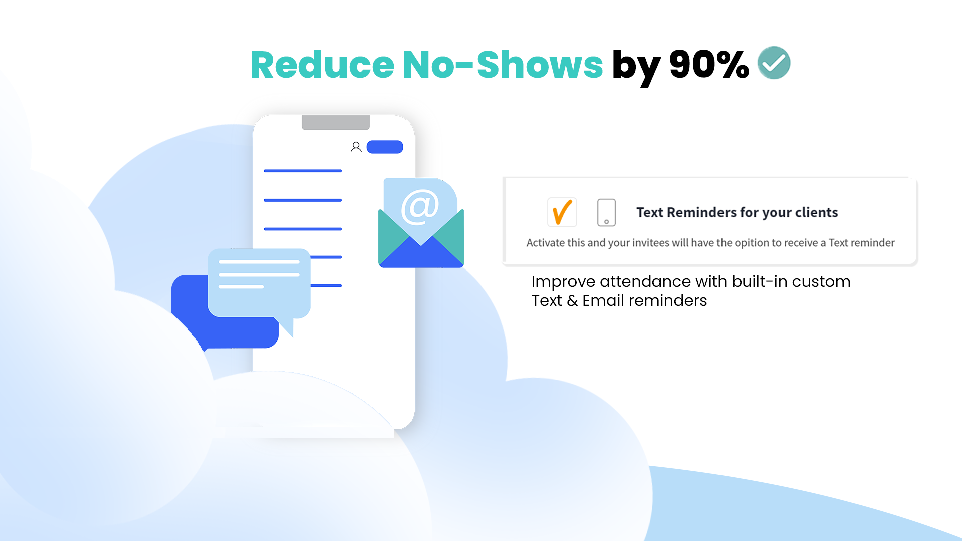 Improve attendance with built-in reminders - Emails and SMS - always keep your clients (and you) informed on upcoming appointments, reducing no-shows massively.