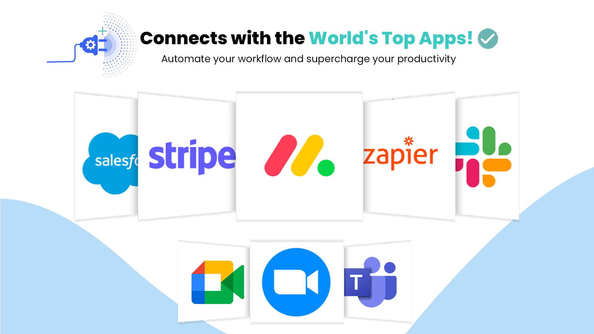 Customize workflows and connect with your favorite video conferencing tools - Zoom, Google Meet, Microsoft Teams - and all major CRMs - monday.com, Hubspot, and Salesforce. (3000+ integrations!)