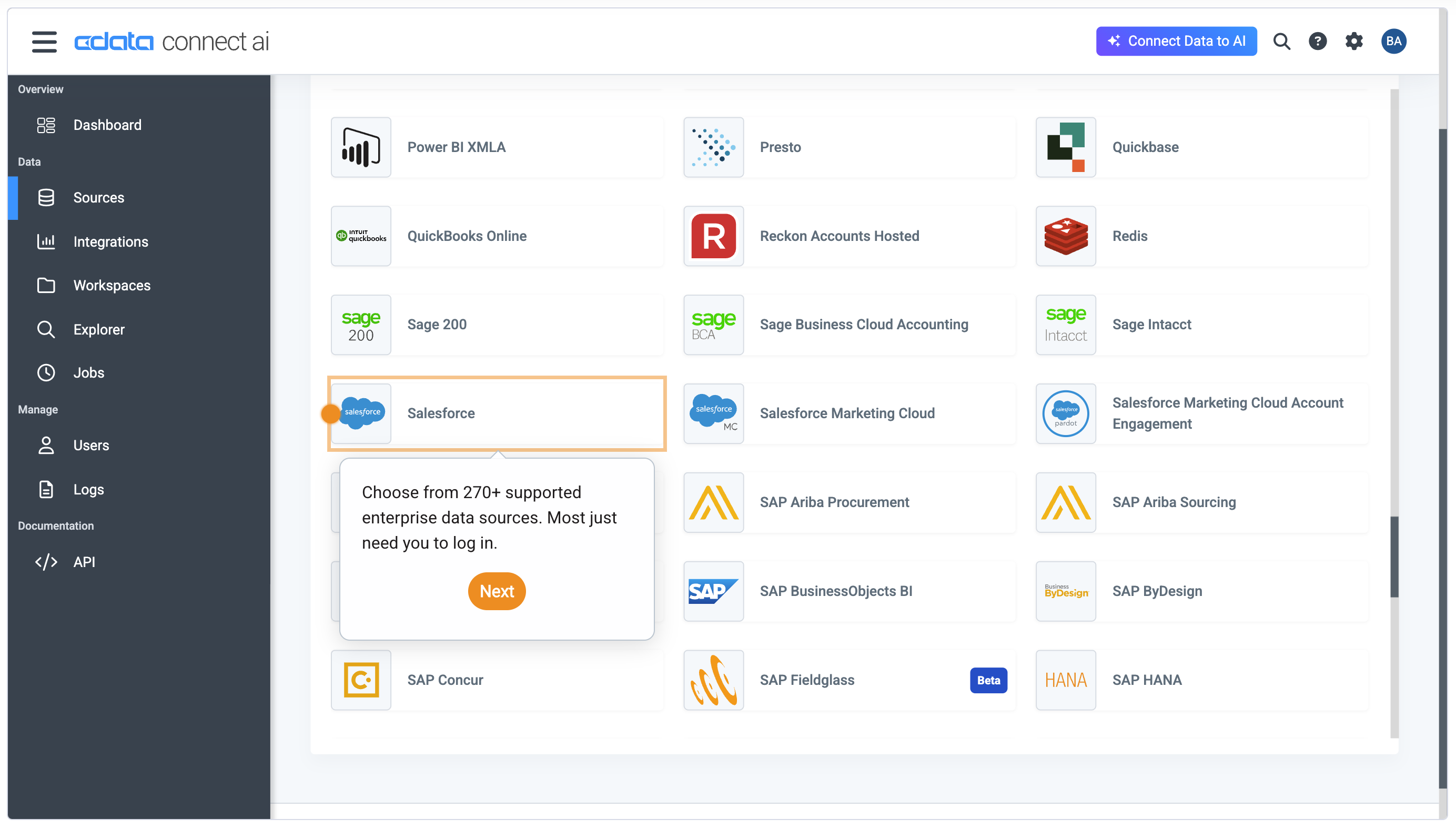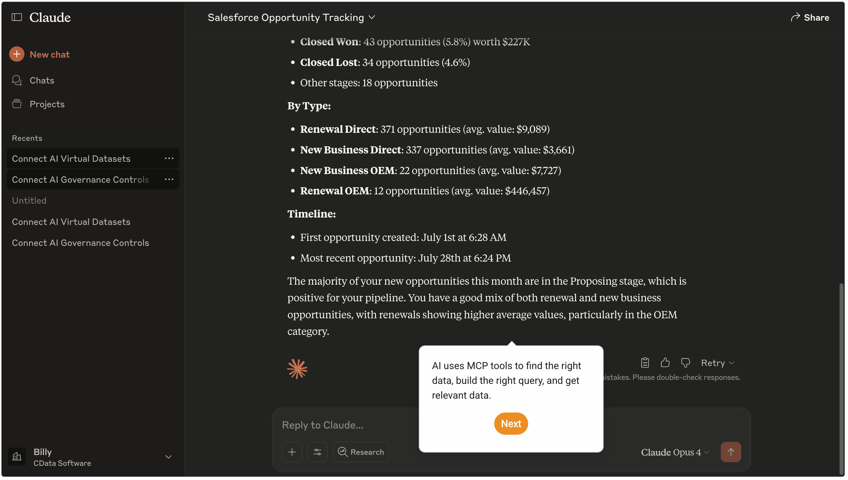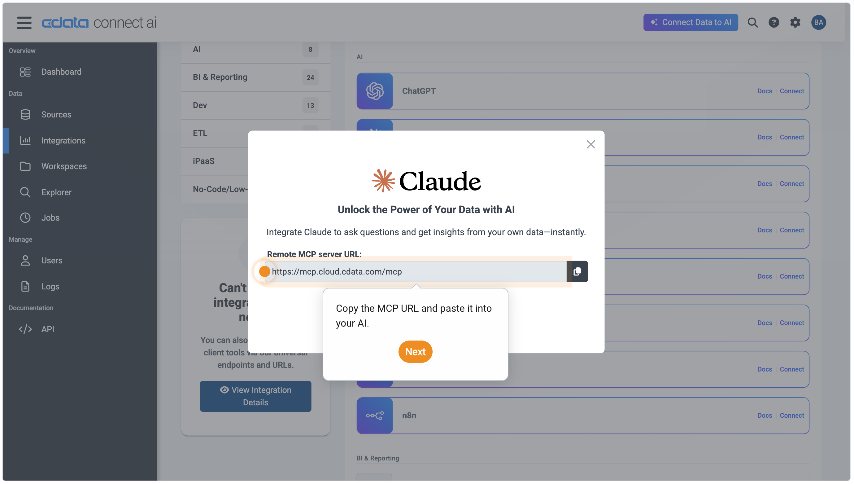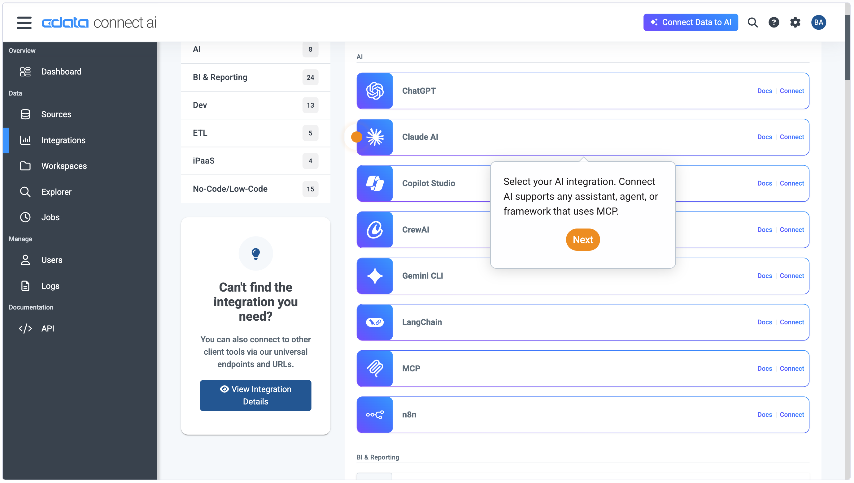 CData Connect AI is the first managed Model Context Protocol (MCP) platform that enables enterprises to safely connect AI assistants, agents, and automation workflows to live data across 300+ business systems. Unlike traditional approaches that copy data into warehouses, Connect AI provides real-time, semantic-rich access to data in-place—preserving metadata, relationships, and user permissions from the source. This means AI understands your business context, not just raw data. Connect AI solves the critical challenge that causes 95% of AI pilots to fail: siloed data and poor governance. With point-and-click setup, enterprise-grade security (SOC2, GDPR, ISO 27001 certified), and inherited role-based access controls, Connect AI makes AI deployments both powerful and compliant. From enabling marketers to query campaign data conversationally, to helping finance teams automate reporting, to empowering product teams to embed data connectivity in their AI features—Connect AI transforms how organizations make AI enterprise-ready.
