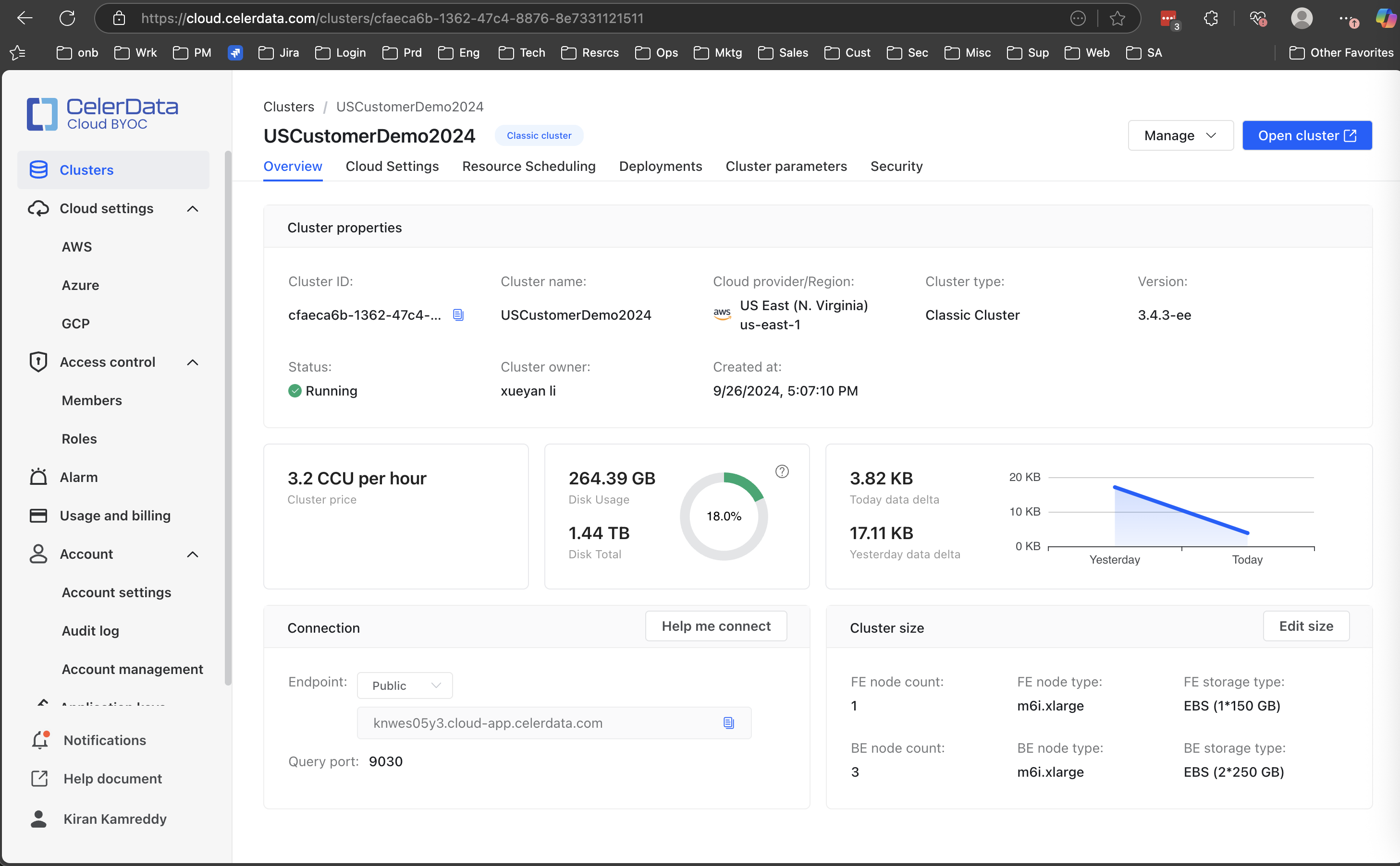 A real-time snapshot of your CelerData Cloud cluster—track status, usage, cost, and performance in one clean dashboard built for both platform teams and data users.