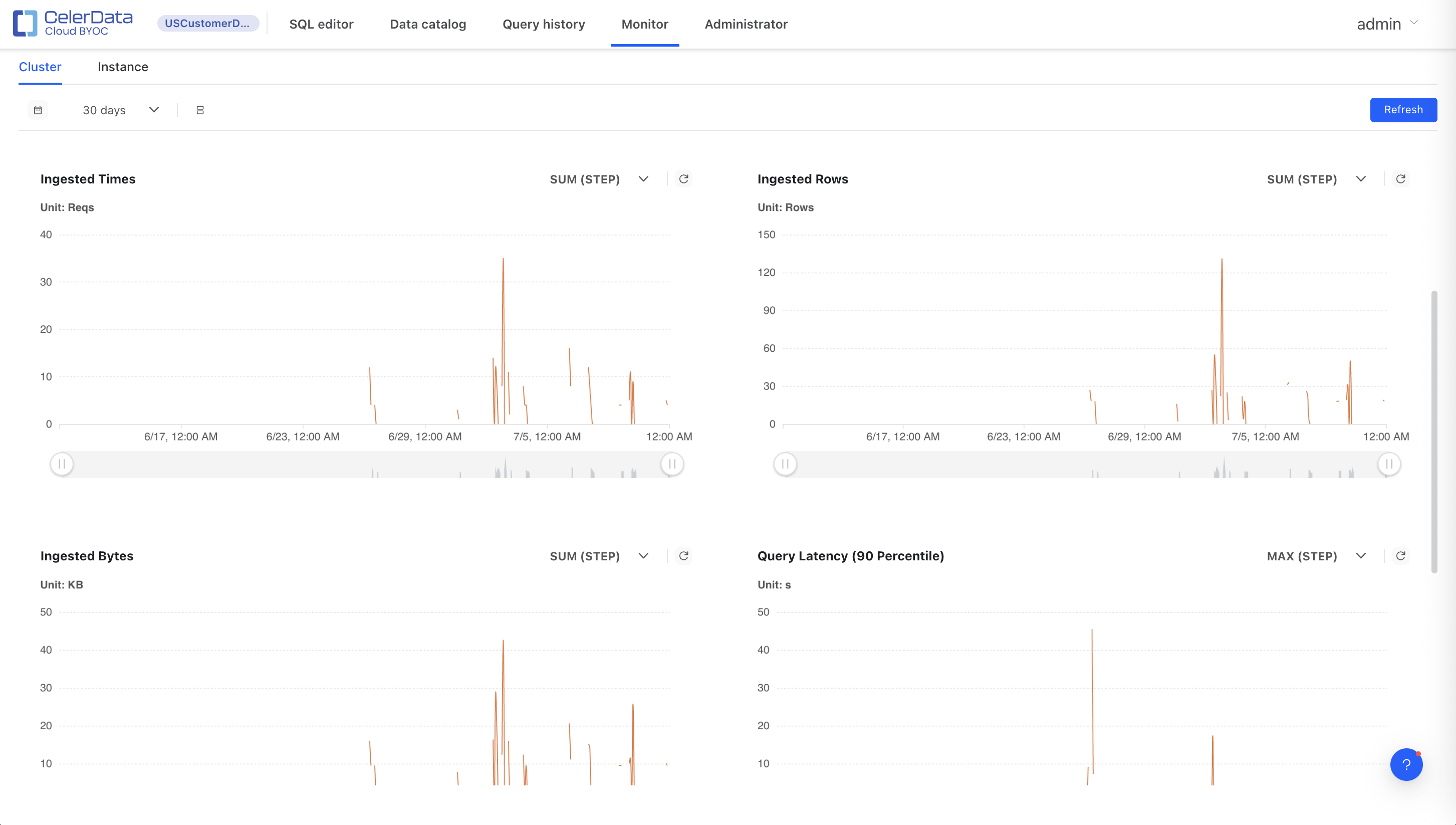 Monitor ingestion and query activity across your CelerData Cloud cluster. This dashboard shows real-time metrics like ingested rows, bytes, and query latency—helping teams quickly understand system behavior and performance over time.