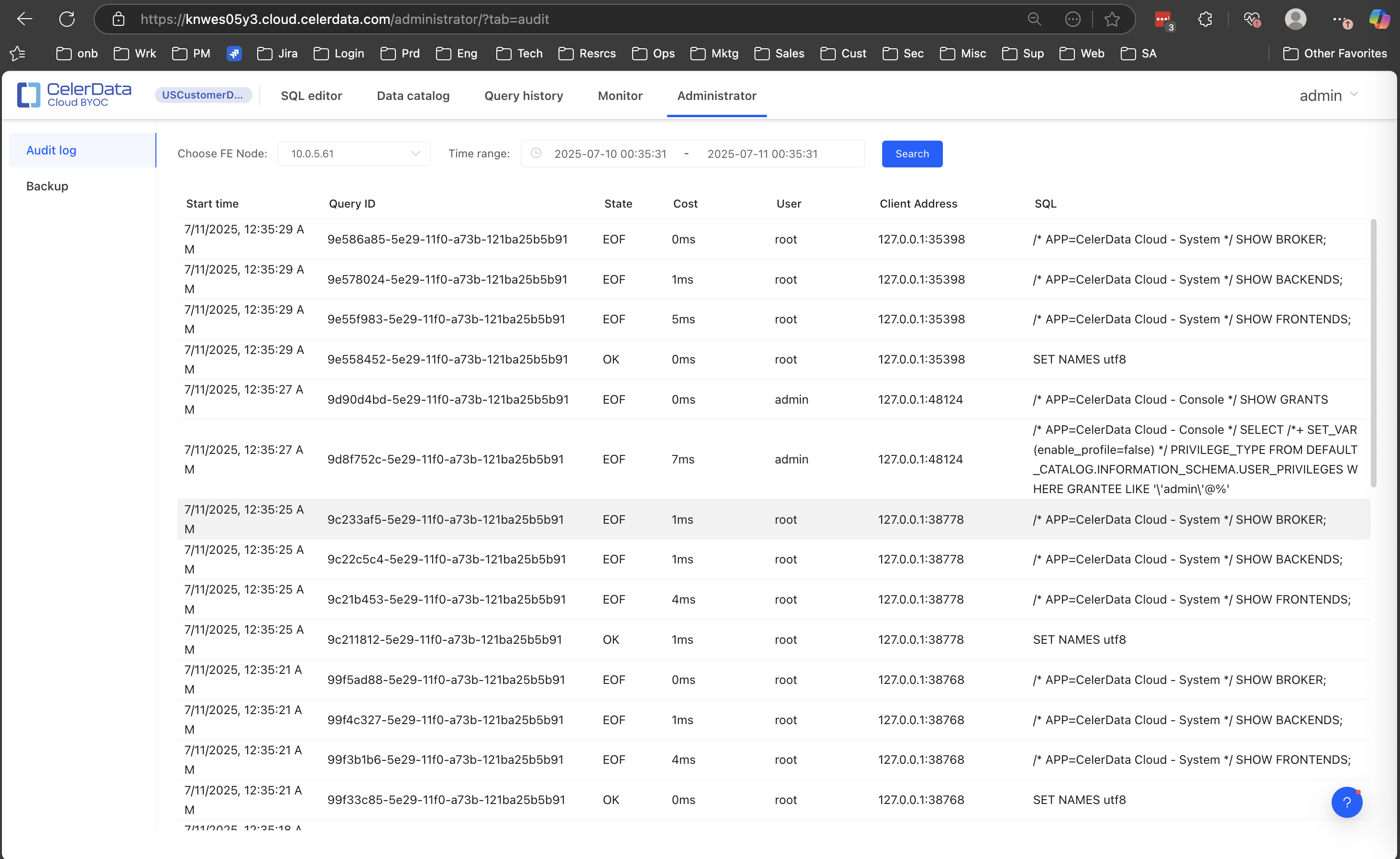 See who ran what, when, and from where. The audit log in CelerData Cloud helps you track query activity, user actions, and access patterns across your cluster—making it easy to troubleshoot issues and support compliance needs.