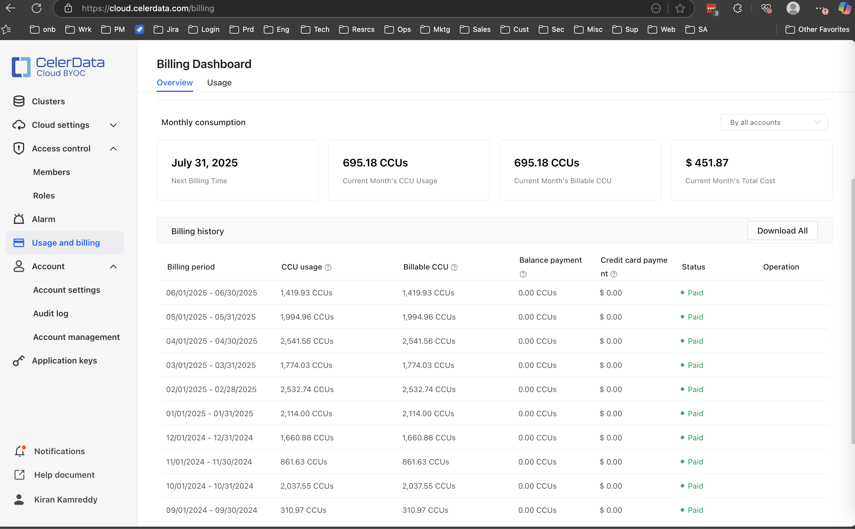 Track usage and costs with full transparency. The billing dashboard shows your monthly CCU consumption, total spend, and payment status—making it easy to stay on top of cloud analytics costs.