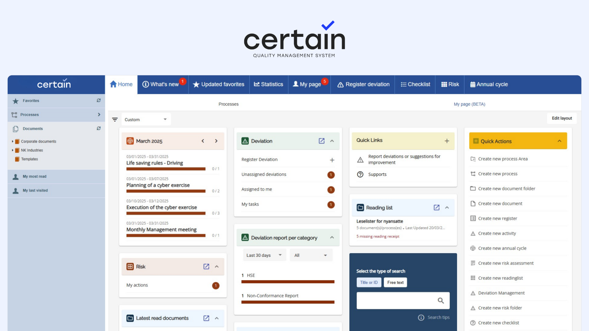 Certain QMS is a quality management solution that helps users to plan, document, monitor and improve their quality work in a single, structured system.