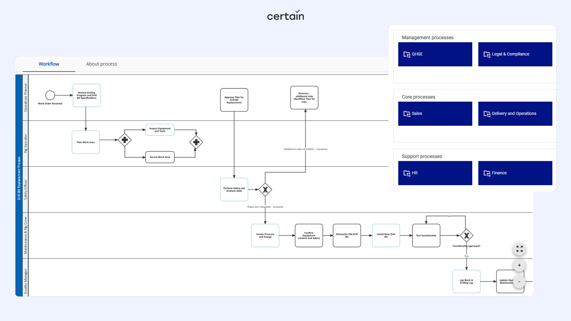 • Process mapping: Visualise workflows and link them to associated documents, tasks, risks and deviations for a fully connected system.