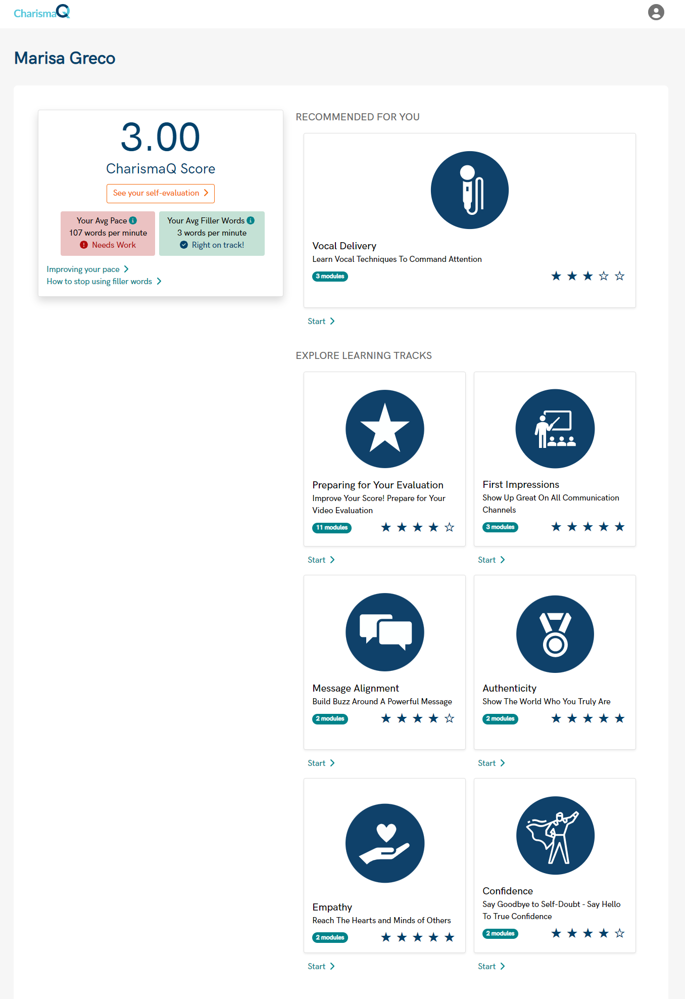 Members receive access to our video evaluation platform as one of the first steps in member onboarding. The video evaluation platform is where members evaluate, score, and practice our six components of charisma - Authenticity, Message Alignment, Empathy, First Impression, Confidence, and Delivery.