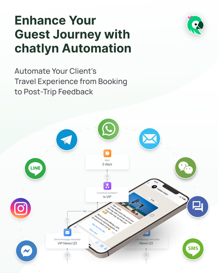 Journey Builder is one of the top features, allows you to automate and create any whatsapp newsletter workflow or update lists, contacts. One of the biggest things is that you can connect it to any API point and could prepare a workflow for different events on perfect time that your customer does. For example, synchronising the time of a guest and receiving different messages depending on their stage (Check-in, check-out…) Even send different messages depending on their answer or the button they clicked.
