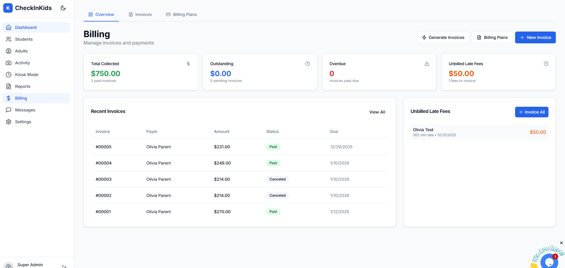 Before / AFTER SCHOOL billing with a LATE fee can be set up