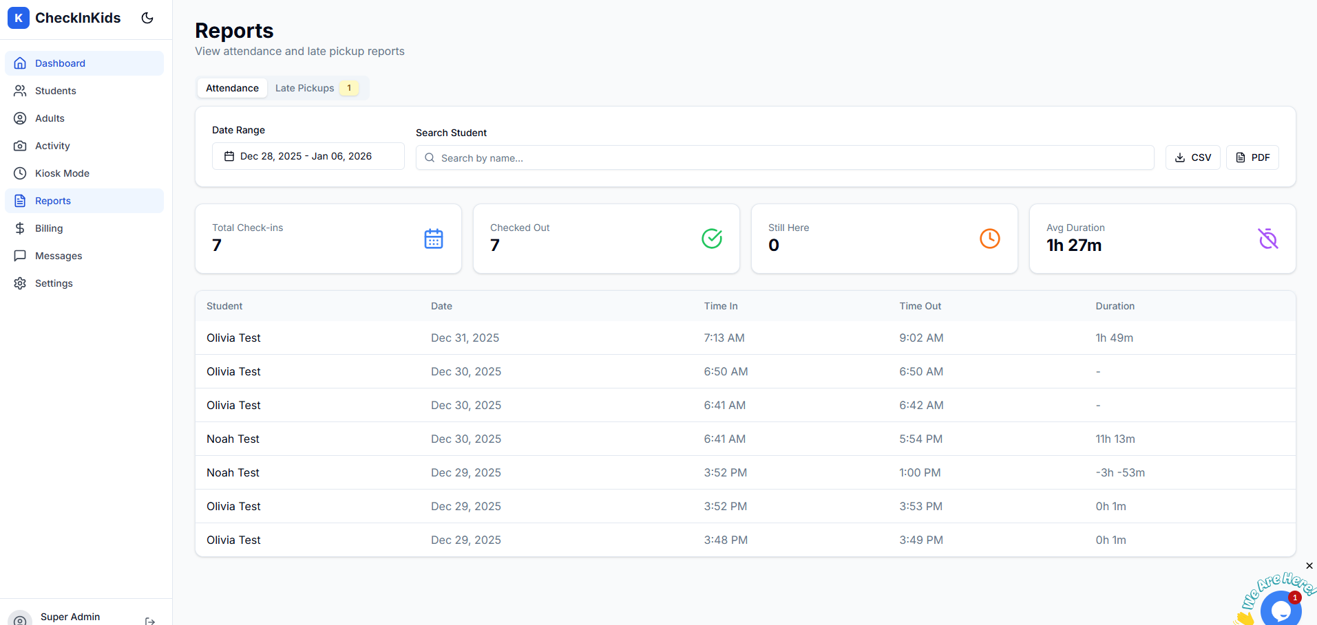 REPORTS: Detailed reports for everything you do is available from the website for student attendance, staff timecard, billing - payments/invoices and entire roster.