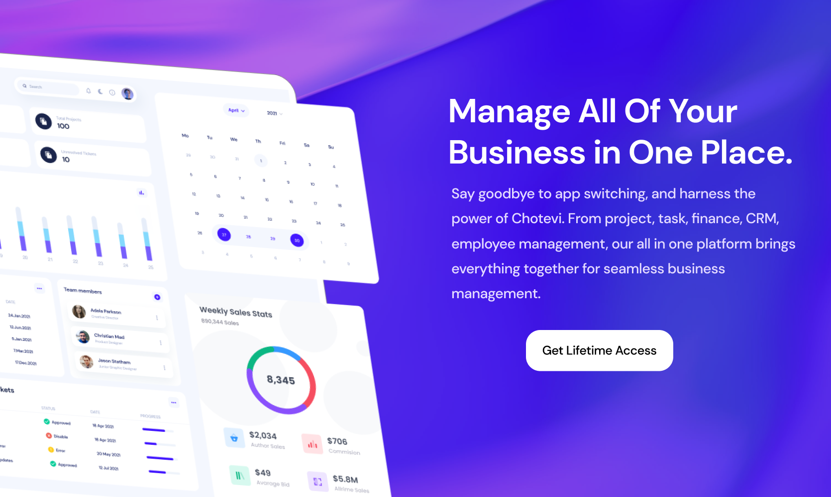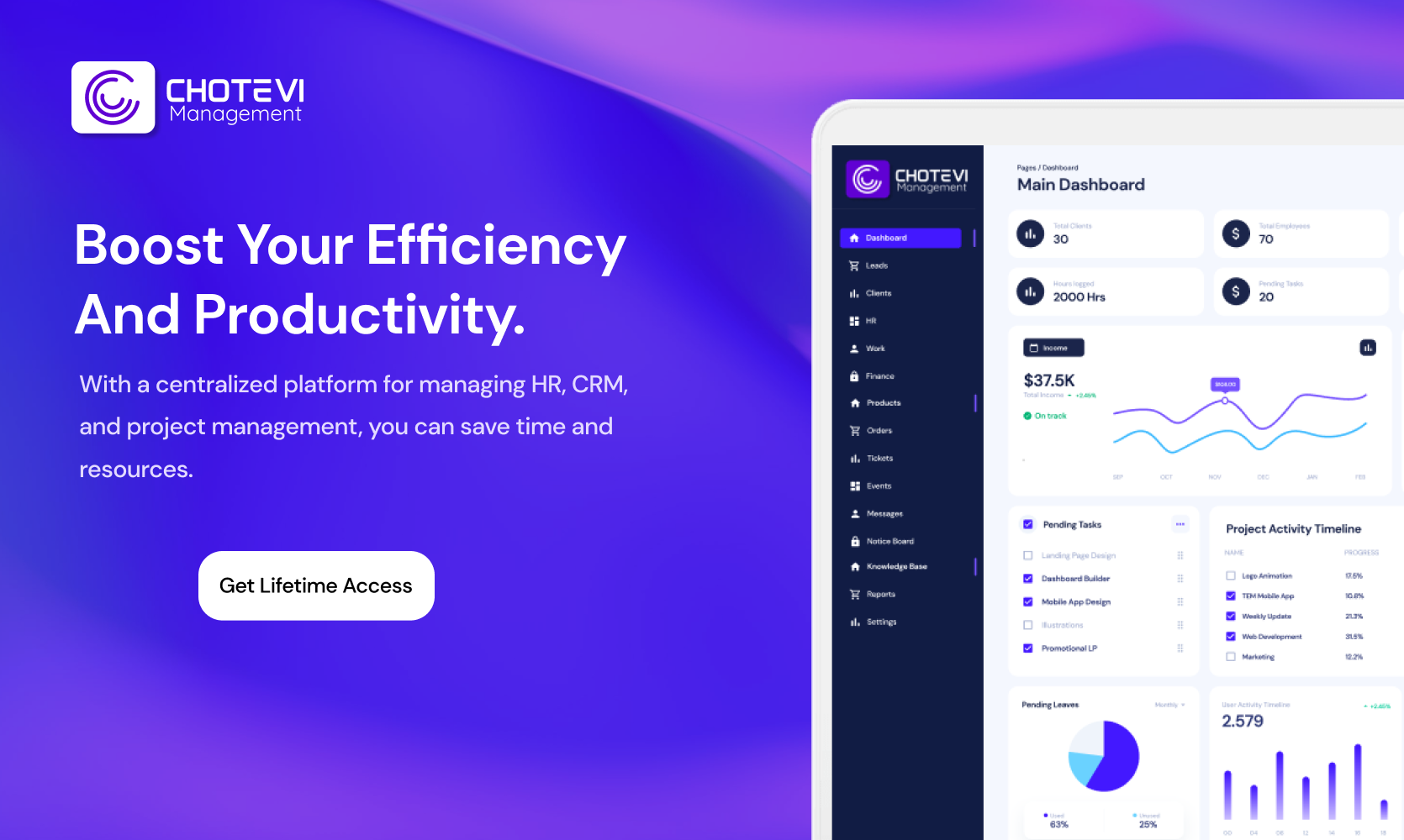Chotevi has been a game-changer for me in managing my business efficiently. There are several aspects that I truly like chotevi for: The All-in-One Solution: Chotevi combines CRM, HRM, and project management features into a single platform, making it incredibly convenient for managing different aspects of my business in one place. It saves me valuable time and effort. I can create projects, assign tasks, set deadlines, and track progress effortlessly. The Kanban-style boards and Gantt charts provide excellent visual representations of project timelines and help me stay organized.