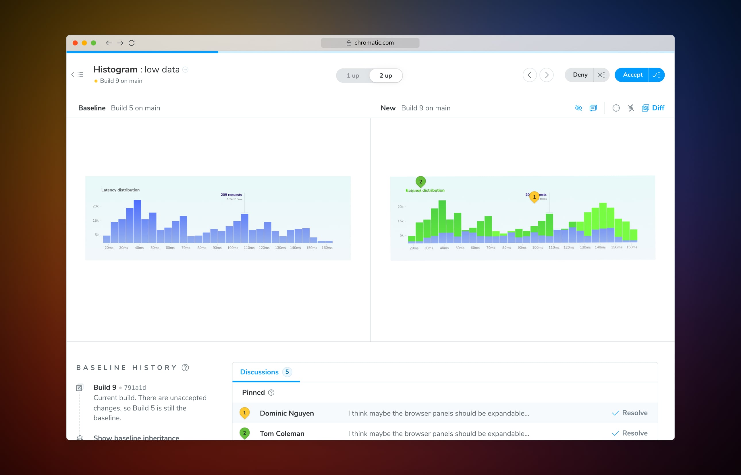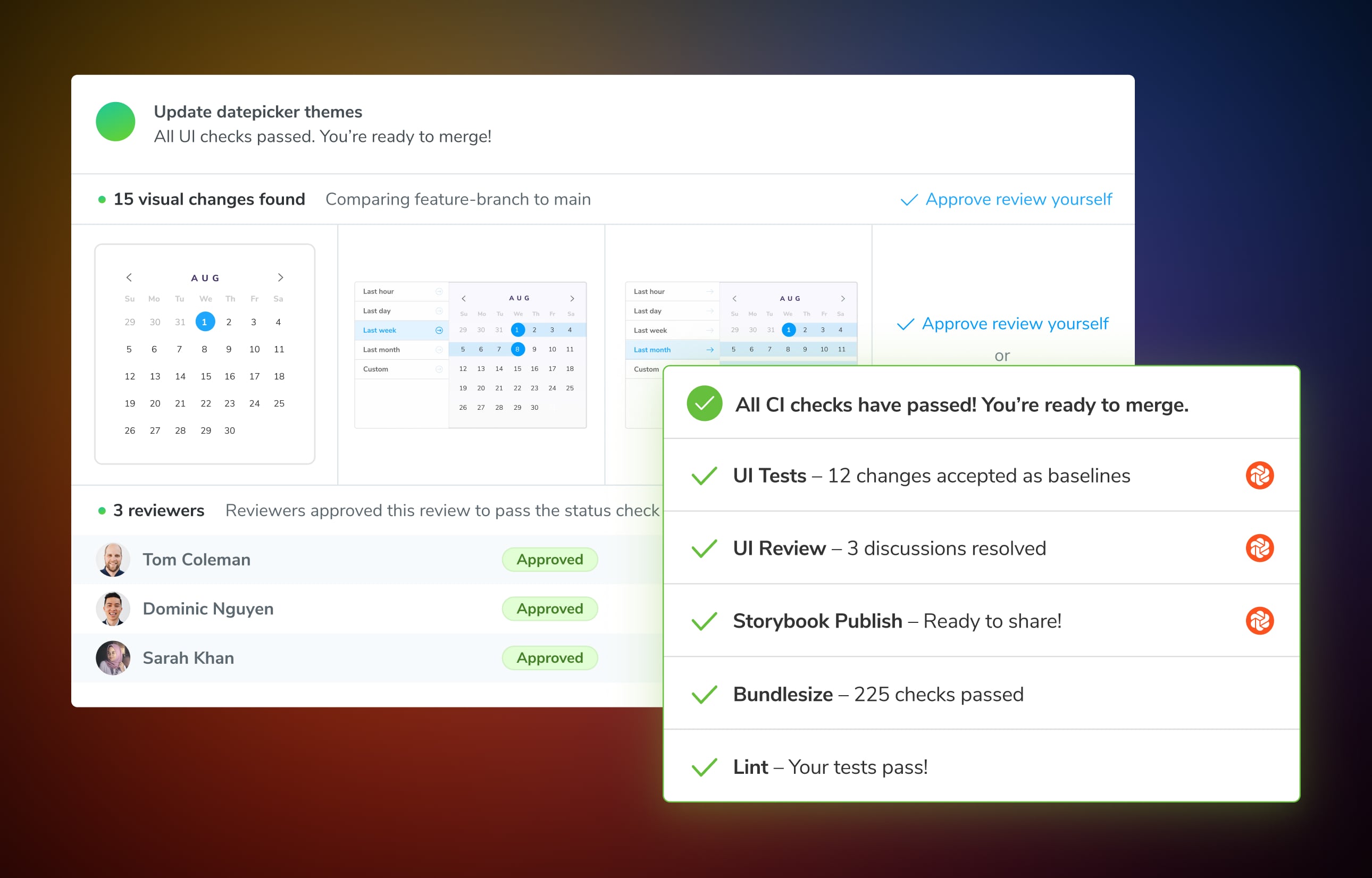 –– Keep UI reviews async, transparent, and moving forward with an approval workflow that lets developers, designers, and stakeholders inspect and approve UI changes. Assign designers, product managers, and other stakeholders to review visual changes as needed on each pull request. Teams can validate expected changes and address unexpected changes without blocking development, or future regressions.