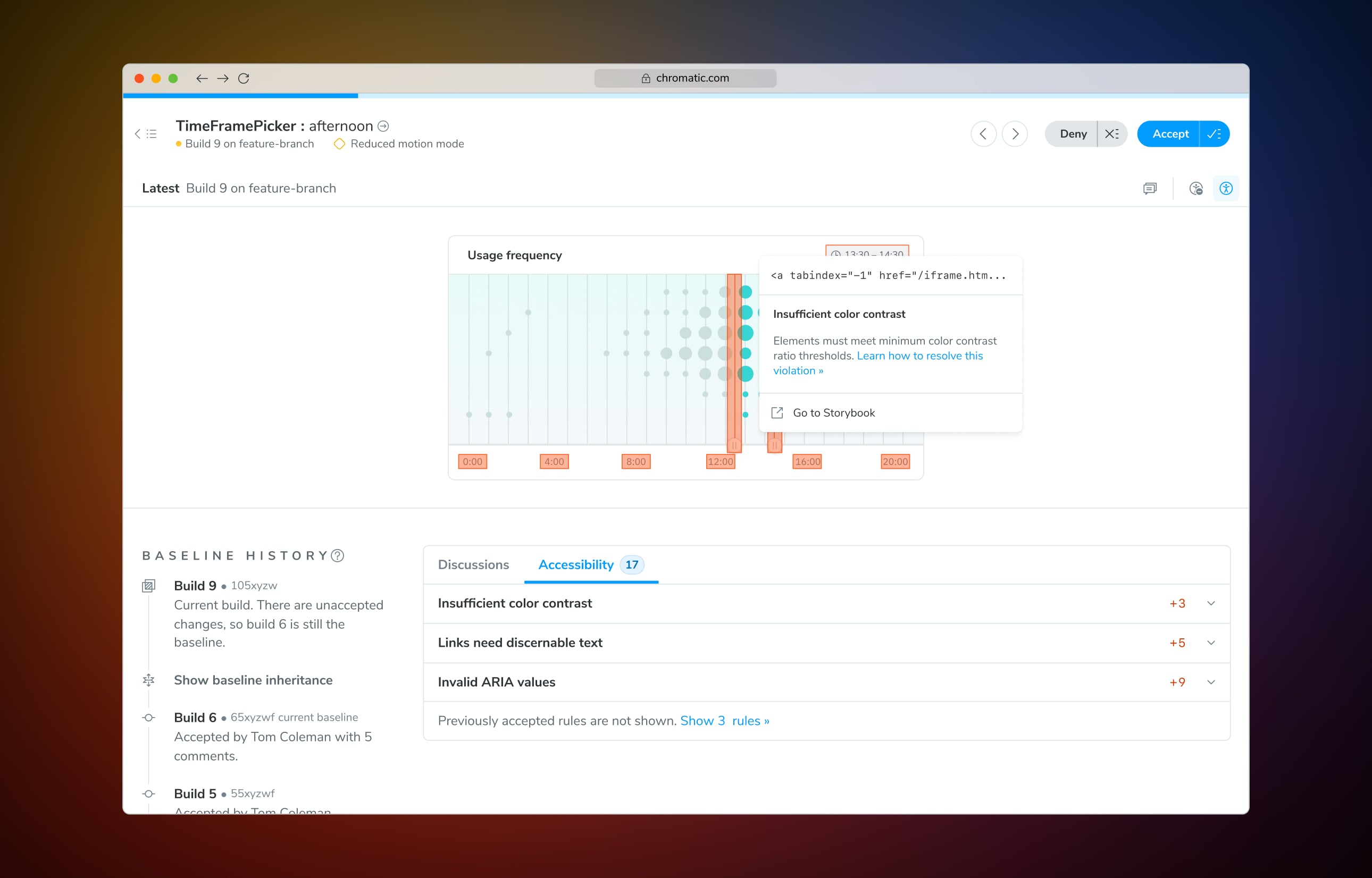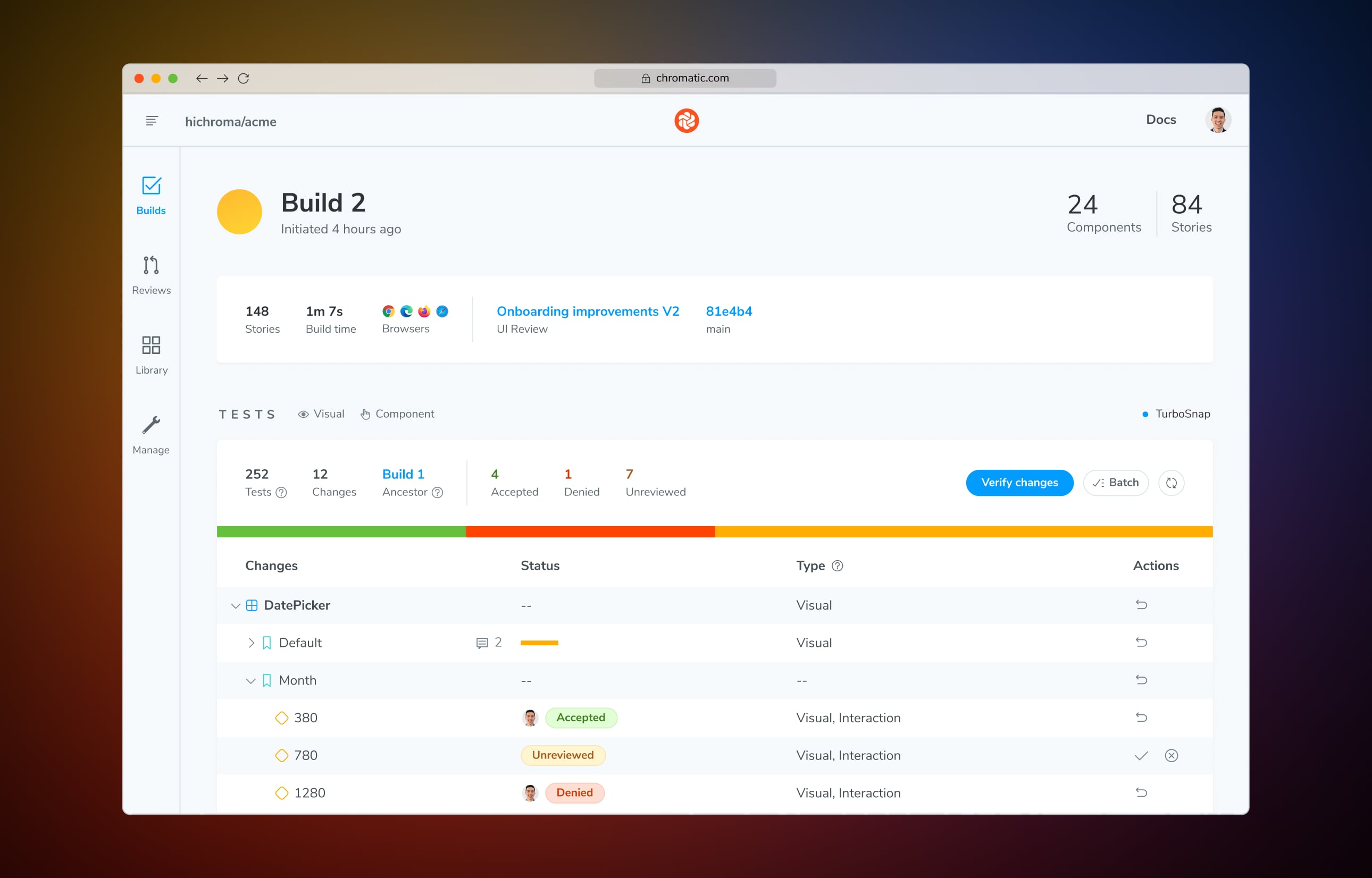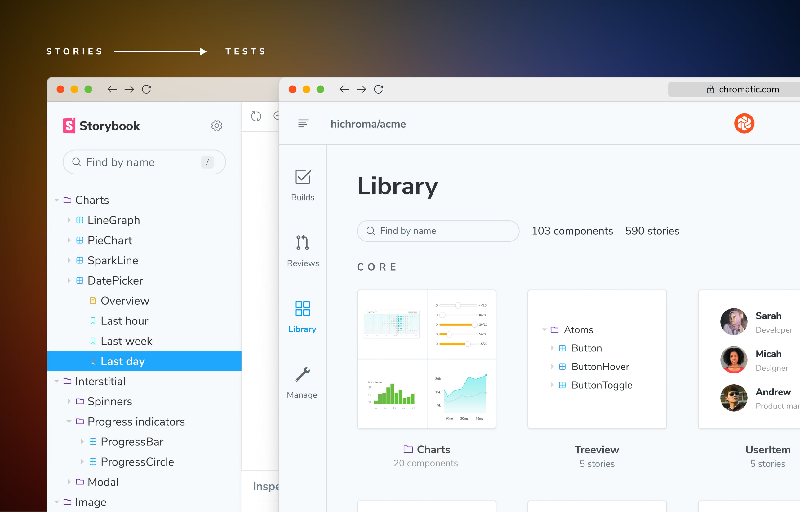 –– Catch visual changes before they reach production by generating pixel-level snapshots to easily spot any unexpected changes. Chromatic runs visual regression tests across real browsers and viewports to validate that your UI looks and functions as expected.