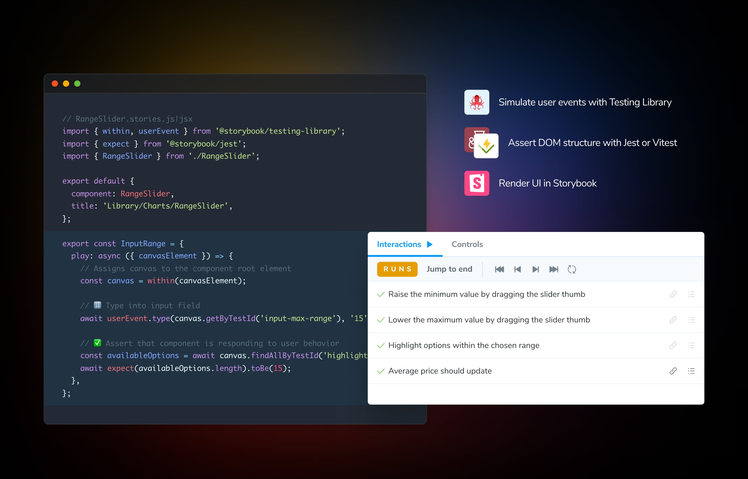 –– Test UI components in every state in isolation before integrating them into larger workflows. Using the native Storybook integration, Chromatic gives developers granular control over visual and functional testing of each state of every UI component. This ensures consistency across design systems, component libraries, and web applications. Simulate clicks, typing, drag-and-drop, and hovers on dropdowns, forms, and nav menus automatically, so nothing goes unnoticed before production.