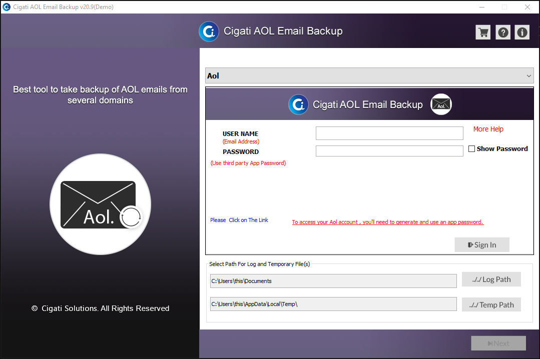 Cigati AOL Backup Tool is one of the best outstanding solutions to backup AOL data files into different file formats such as PST, EML, EMLX, PDF, TXT, MBOX, HTML, etc. The AOL backup software directly migrates mailboxes from AOL accounts to Gmail, Yahoo, Hotmail, Thunderbird, Office 365, Live Exchange, Outlook, etc. email clients. The software allows to restore mailboxes from single or multiple AOL emails and AOL data files into different email clients directly without any data loss. This means it migrates several mailboxes into a single attempt with high accuracy. This backup utility ensures that there is no loss of any data while performing AOL email migration. Software is capable of maintaining data integrity during the entire backup process. The Cigati AOL Backup Tool is highly compatible and runs smoothly on all versions of the Windows O S. It allows you to backup an AOL account email on all versions of Windows including Windows 10 and other earlier versions. You can backup or migrate multiple AOL data files at one go means software can take multiple data files for migration too. This helps to reduce the efforts of the user totally. Also, this software has no file size limitations. In this professional tool, users can preview all attributes and attachments of AOL data files after backing up. This AOL backup software offers an amazing Mail Filter option to filter AOL emails as per their date. By using this feature, users can save the required emails to be converted into other file formats. You just need to set the start and end date then the tool will automatically backup the email as per its date. If somehow connection breaks, then users are allowed to resume the process of uploading from the endpoint where the connection breaks. So there will be nothing like restart or reprocessing. Before purchasing this amazing software, users are advised to use the download and use the demo version of the Cigati AOL Backup Software.