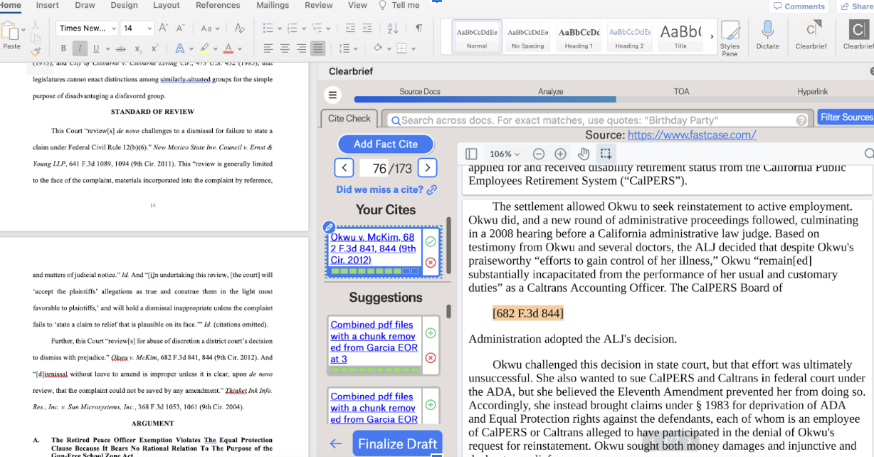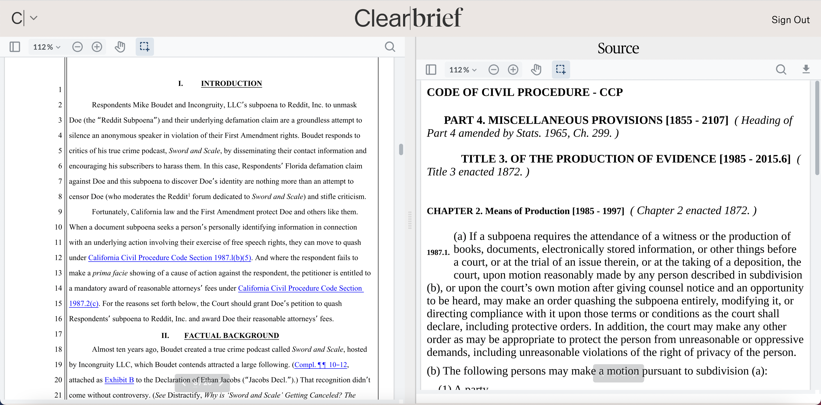 The ability to link to a source document doesn't feel very user friendly or intuitive, it's a bit clunky to understand how to appropriately link a statement to a portion of a source document, not very user friendly in terms of having flexibility about how a citation to a source document appears, once I've created a timeline and linked factual citations to a source document I want to be able to continue going back to that draft with live links but it seems that doesn't work. I am also still having trouble with the table of authorities generating with no page numbers. Review collected by and hosted on G2.com.
