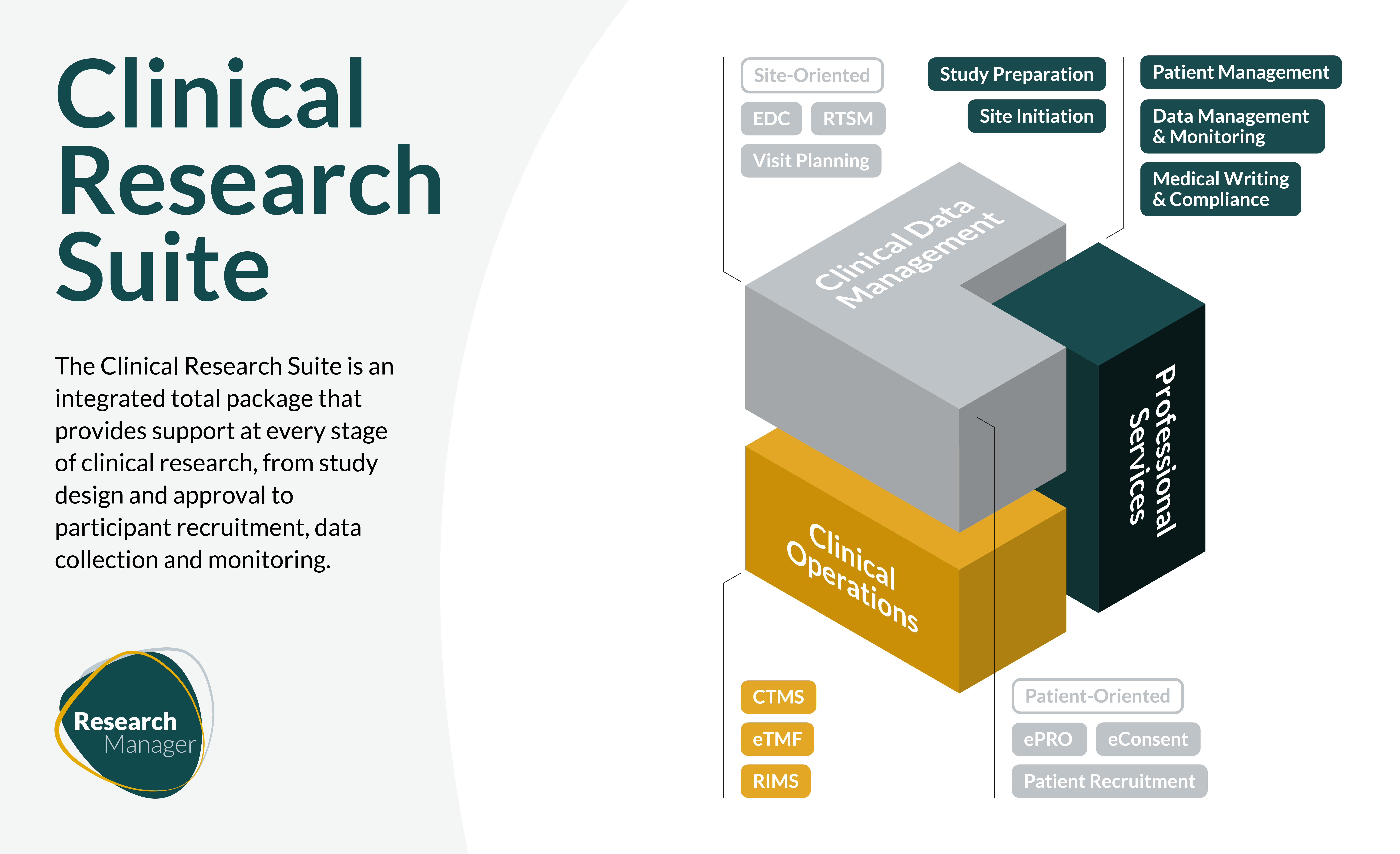 With the Clinical Research Suite, we provide a fully integrated solution for academic institutions, healthcare organizations, CROs, and sponsors across the entire clinical research lifecycle. From study setup and regulatory approval to recruitment, data capture, and monitoring.