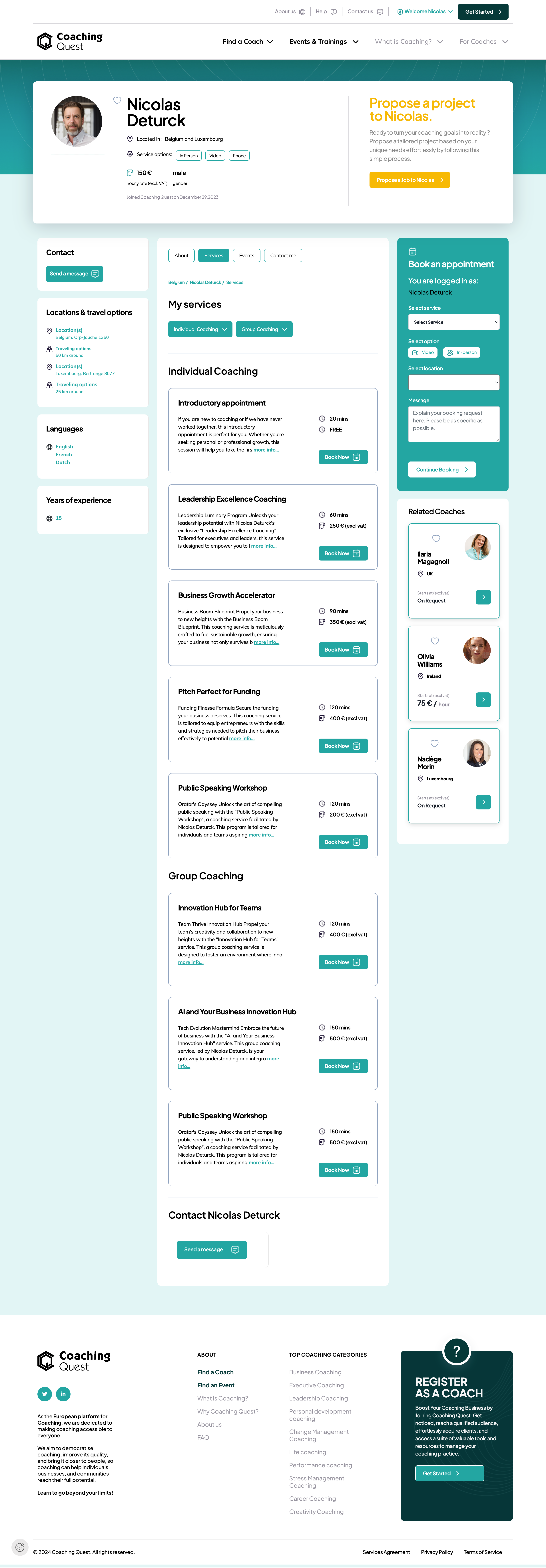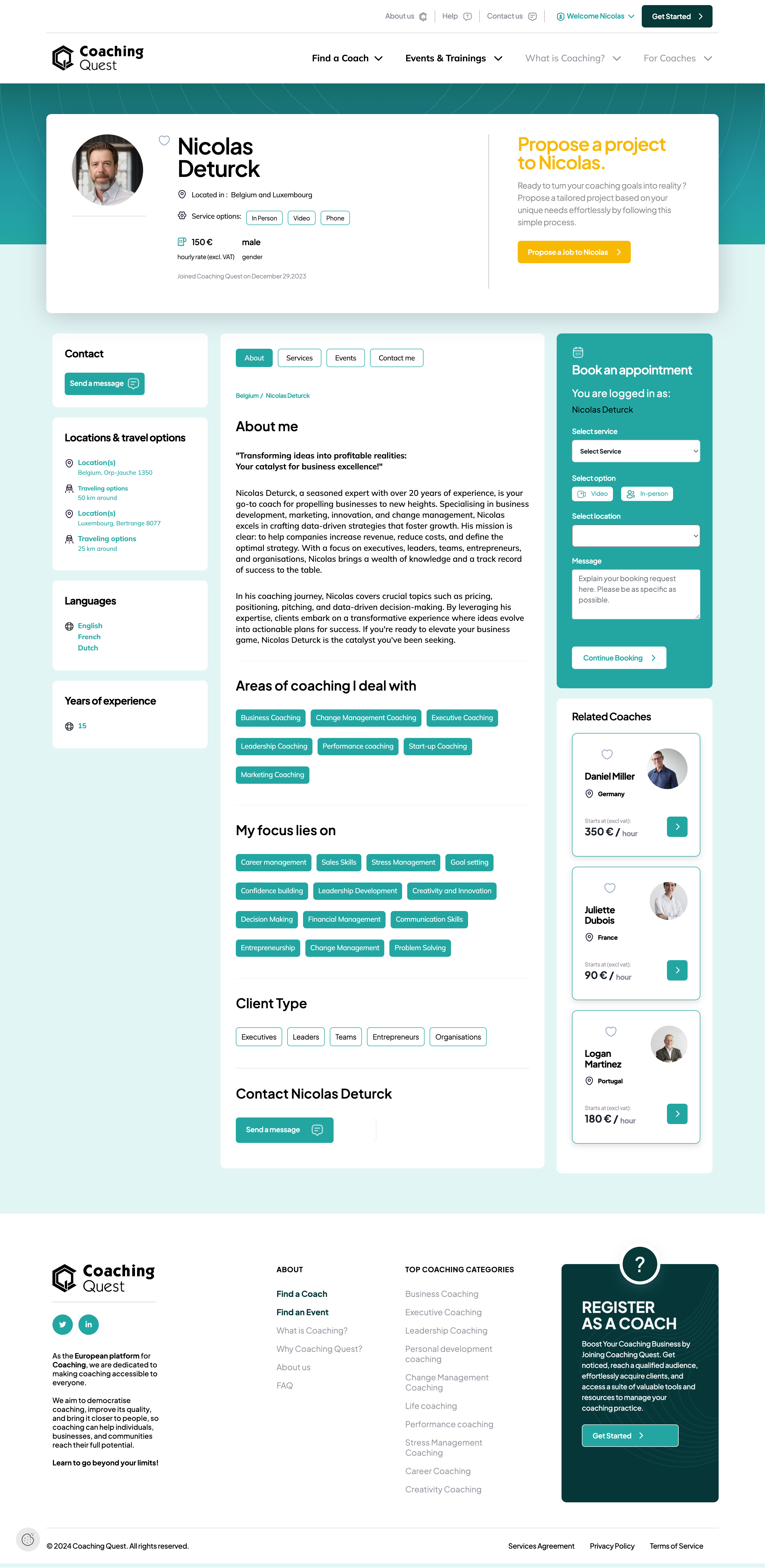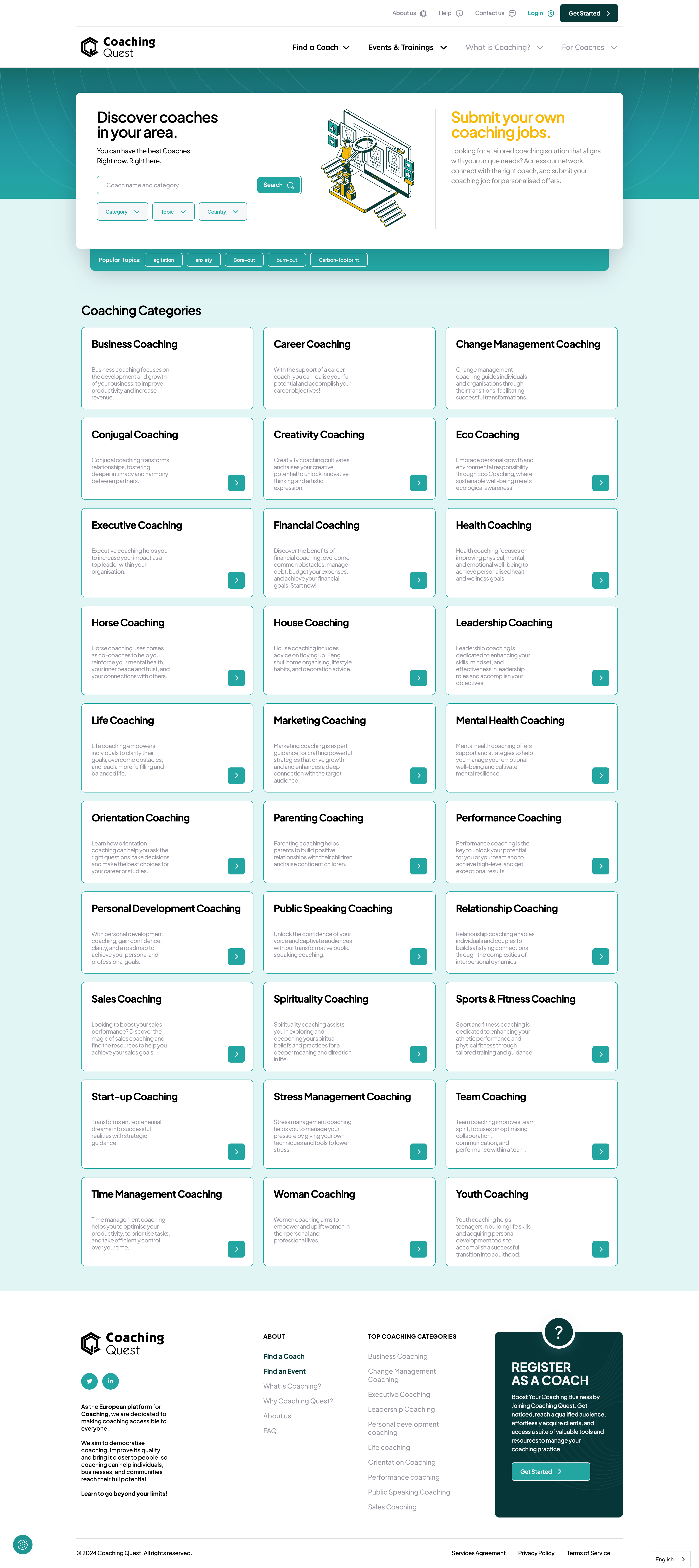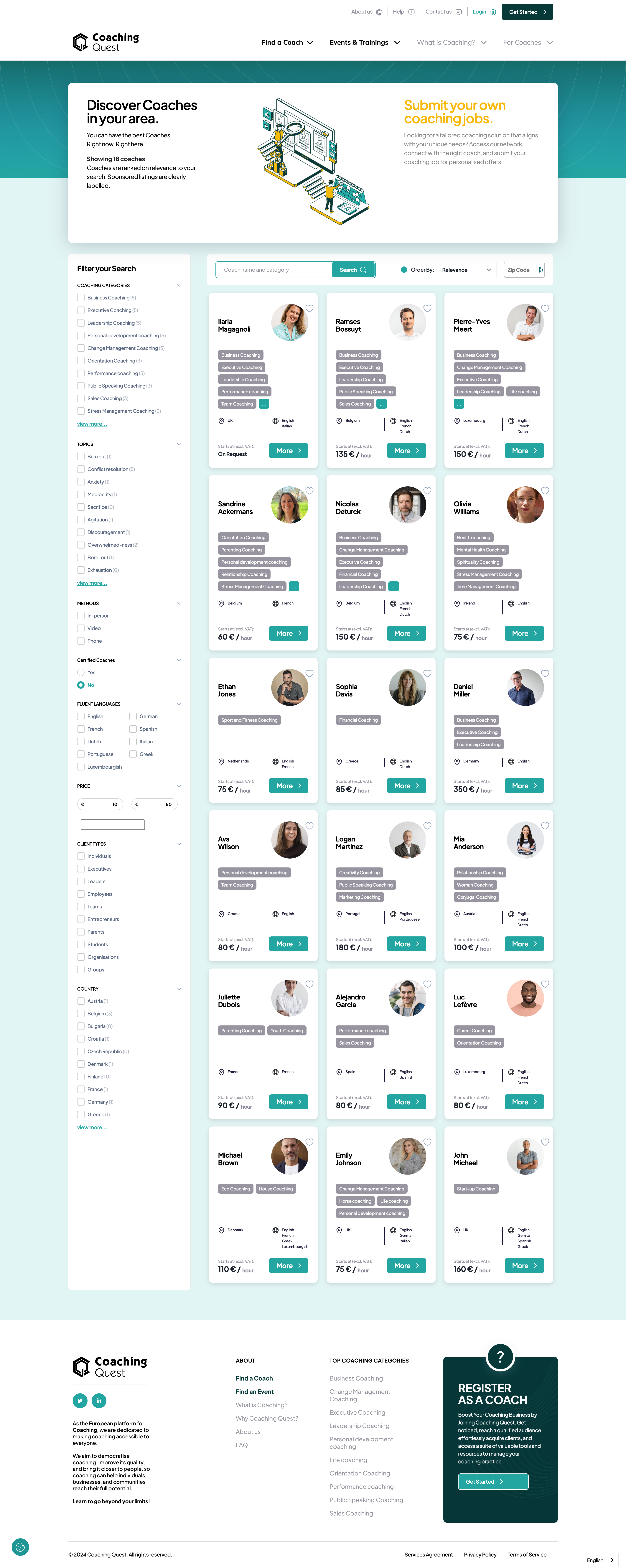 Coaching Quest is a European-based digital platform built specifically to empower coaches to grow their business, expand their visibility, and connect meaningfully with clients. Coaching Quest is a premium coaching marketplace where coaching professionals can showcase their expertise and individuals or organisations can easily find the right coach for their unique needs.