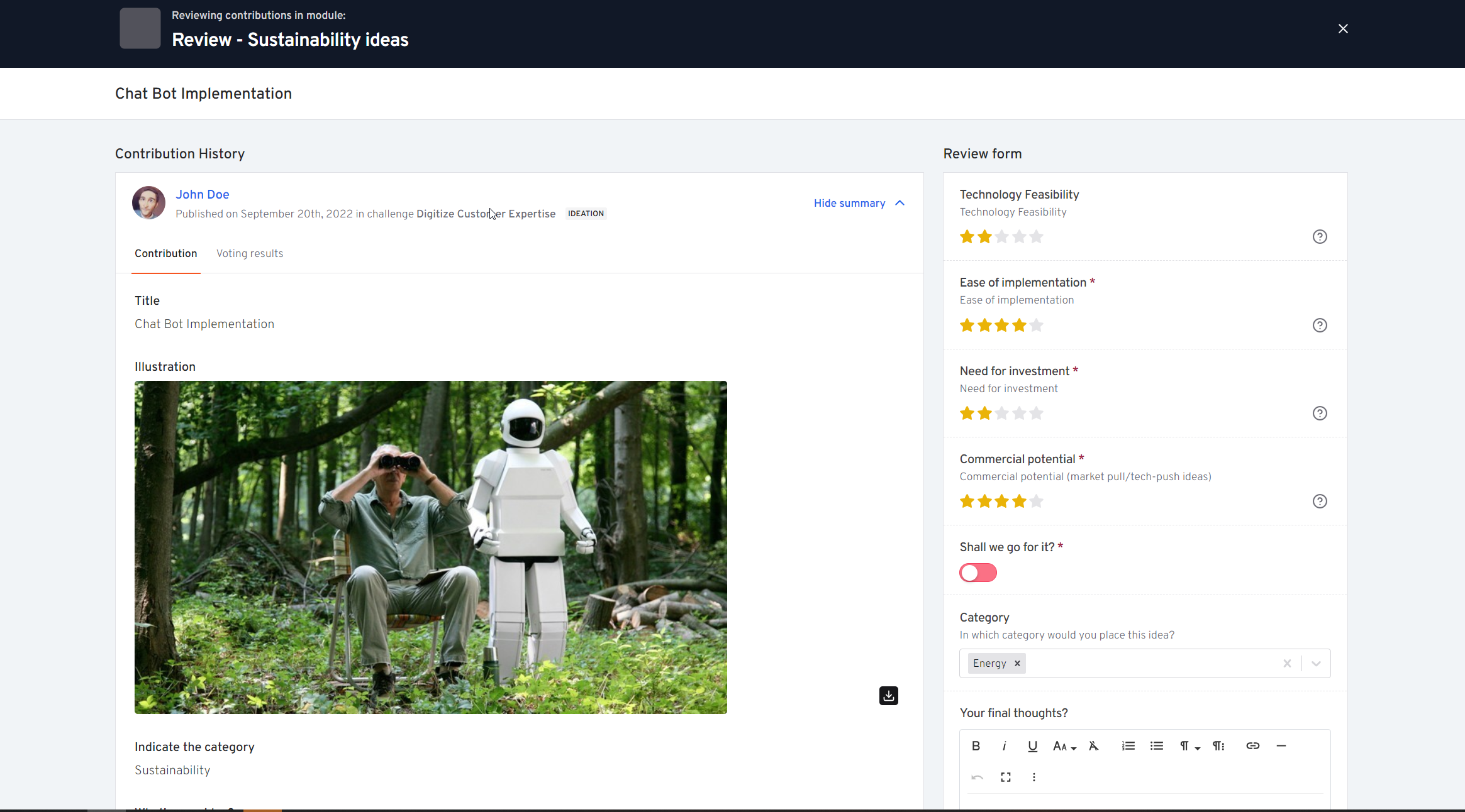 The platform provides workflows and tools to manage the entire innovation process, from idea generation and evaluation to project execution, ensuring that ideas are systematically captured and developed. Review collected by and hosted on G2.com.