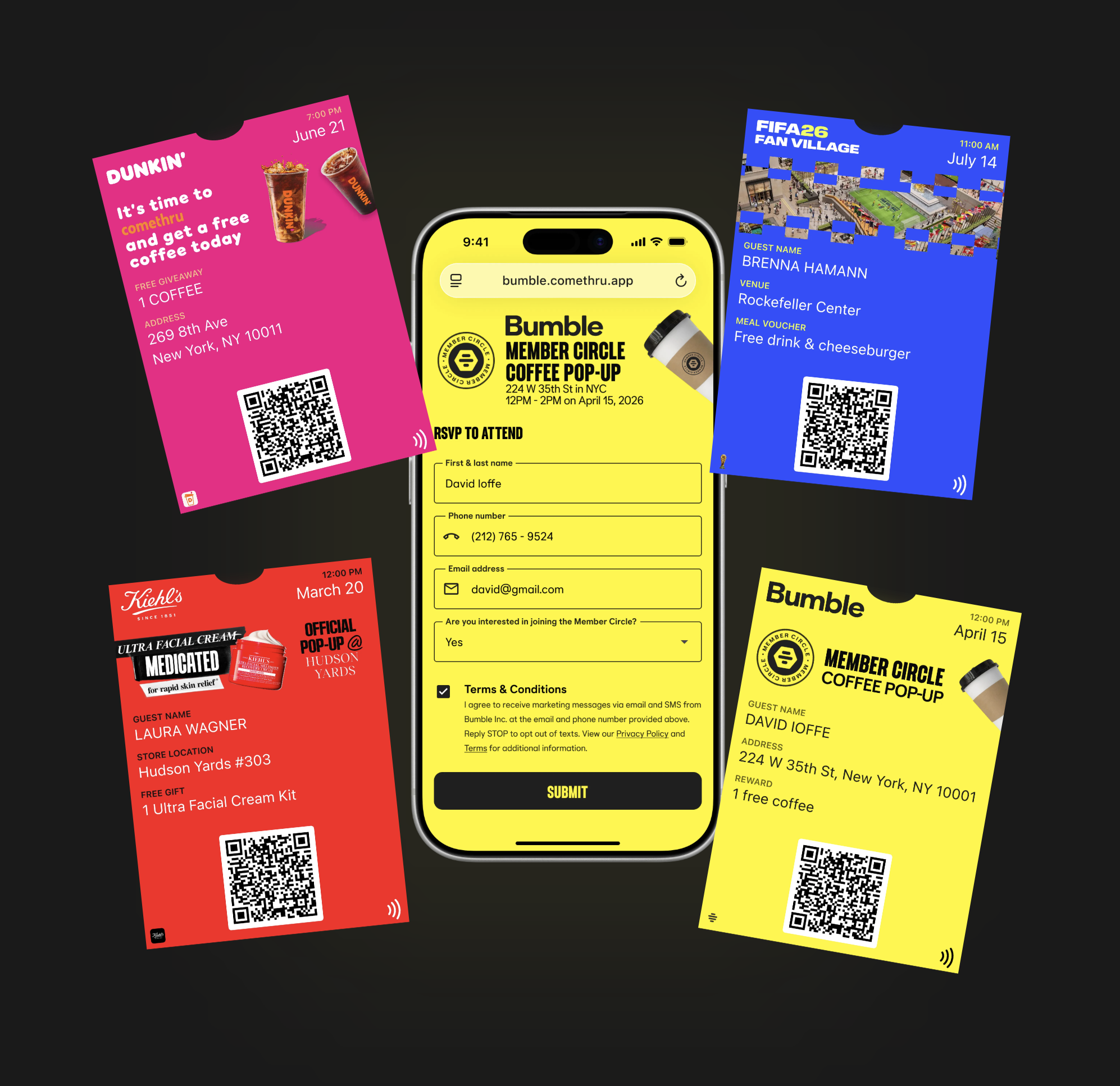 comethru distributes branded digital passes (Apple Wallet and Google Wallet) to event attendees in real time, requiring no app download. Once a pass is saved to a user's device, brands unlock a persistent retargeting channel, reaching those attendees post-event via SMS, push notifications, and email. The platform handles pass creation, distribution, audience capture, and campaign execution in one workflow.