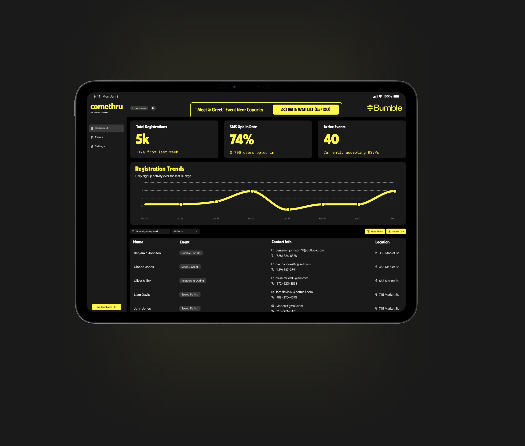 The core value comethru delivers is turning anonymous event foot traffic into an owned, opted-in audience. For D2C brands, experiential agencies, and marketing teams running activations at festivals, pop-ups, retail experiences, and sports venues, comethru converts sponsorship spend into measurable, repeatable audience growth, without relying on third-party data or platform algorithms.