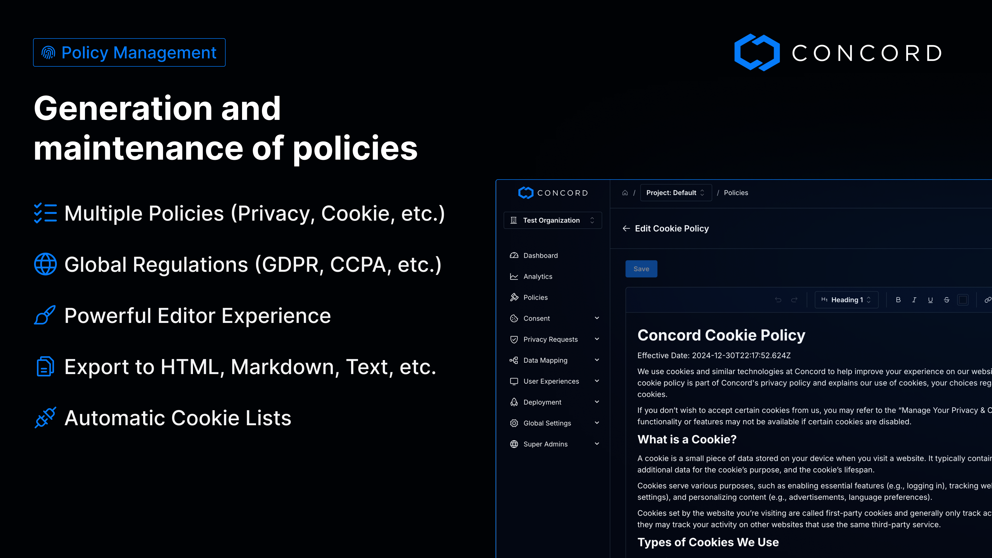 Concord doesn't generate a privacy or cookie policy yet. I am told that it is planned and should be released soon, possibly as early as in couple of months.