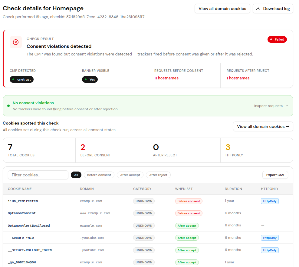 With zero integrations required, Consent Checker continuously monitors websites for compliance drift and flags enforcement failures, UI-level consent issues, and unauthorized third-party data sharing that create legal risk under GDPR, CPRA/CIPA, and 20+ emerging U.S. privacy laws. Every run generates a detailed, audit-ready report with tracker evidence, cookie placement changes, and remediation guidance — supported by an AI assistant that explains risks and recommends fixes.