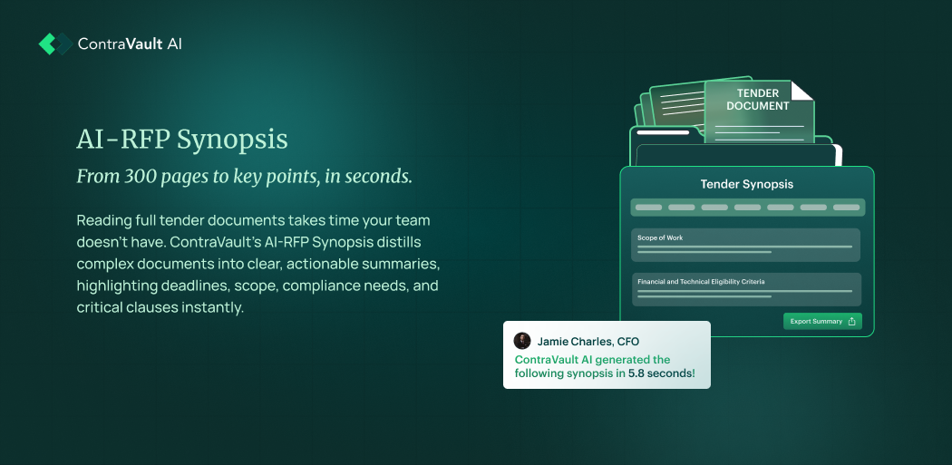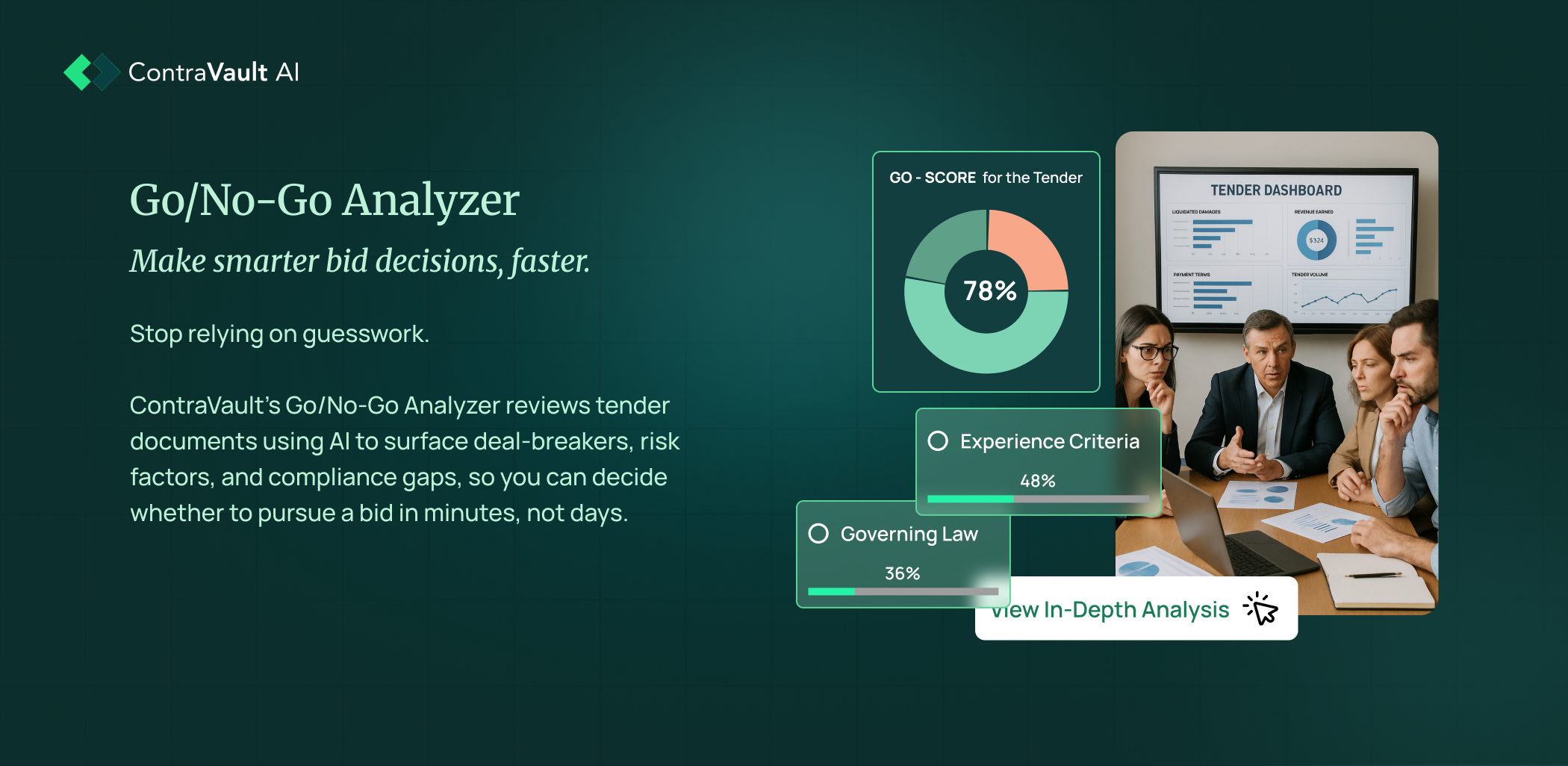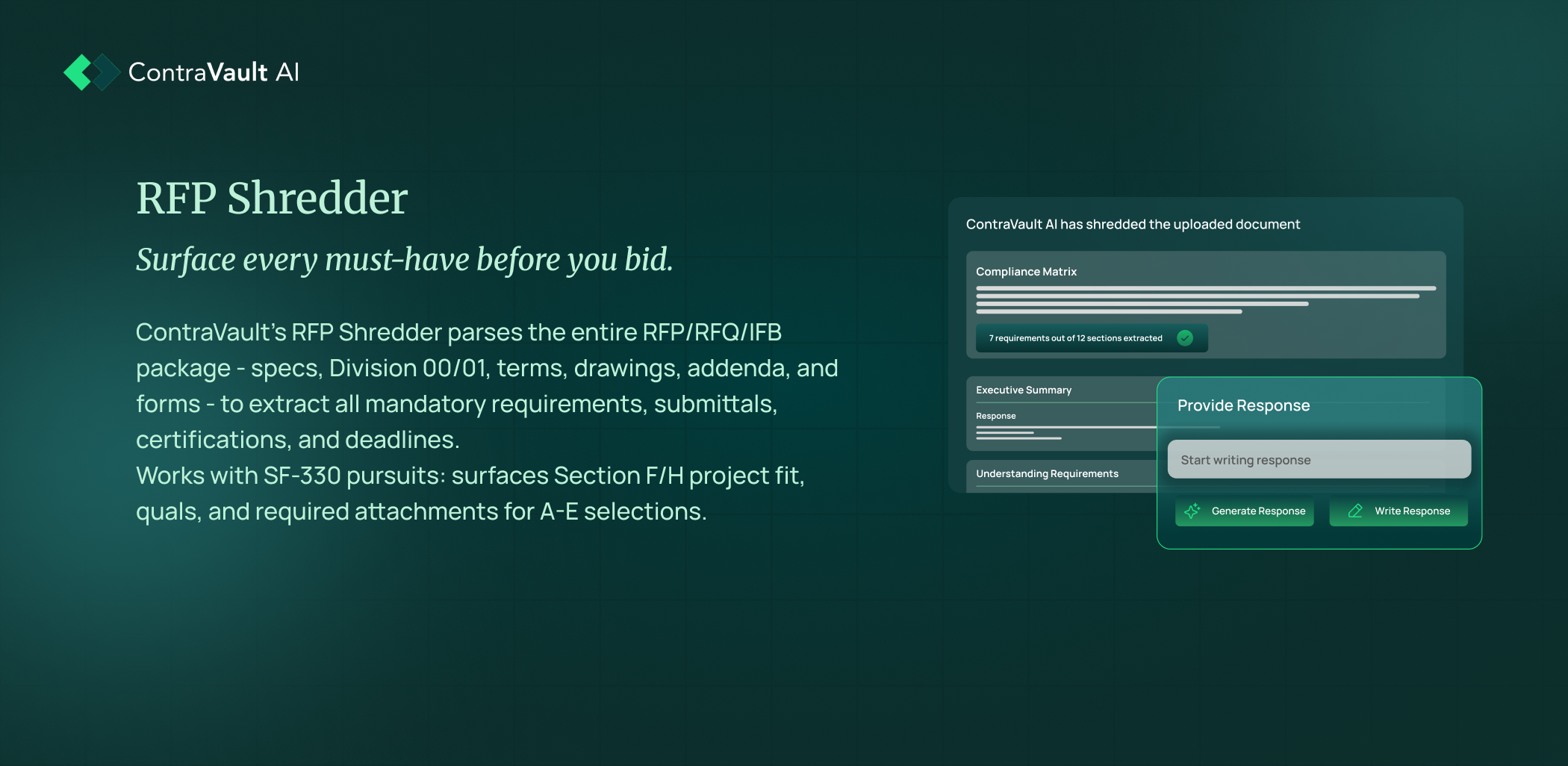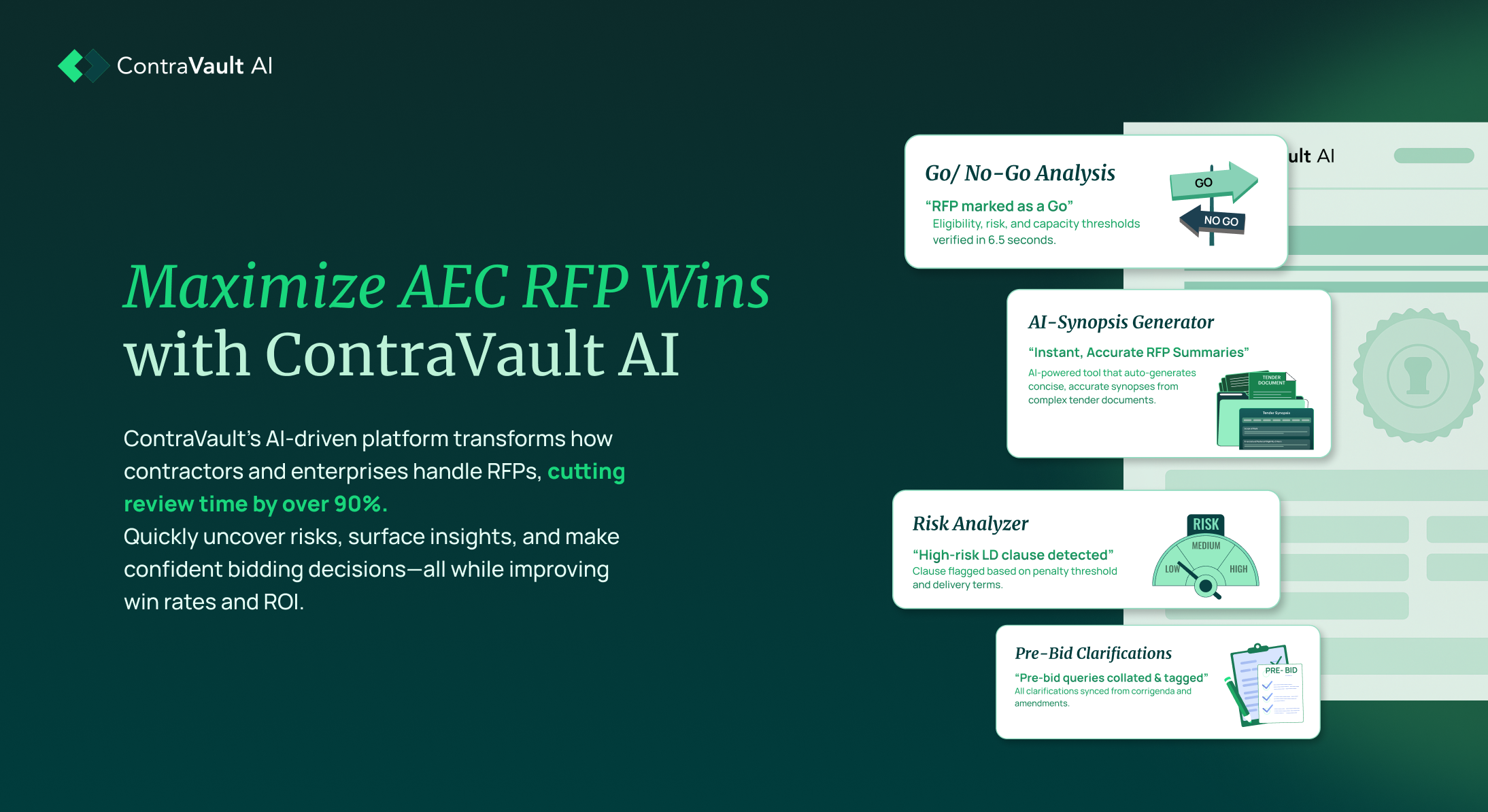 ContraVault AI is the industry leader in AI-Powered AEC RFP Analysis with a suite of intelligent solutions to help US architecture, engineering, construction contractors, procurement teams, and enterprises win more bids with smarter, faster decisions. ContraVault AI automates Go/No-Go analysis, risk detection, and document summarization so your AEC teams can deliver winning responses to government RFPs, private sector projects, construction contracts, and infrastructure pursuits 90% faster. Harness a single source of truth so your bid teams can quickly identify deal-breakers, surface hidden risks, and confidently respond to AEC opportunities with the best insights from the most intelligent tender analysis solution built for the competitive US construction market.