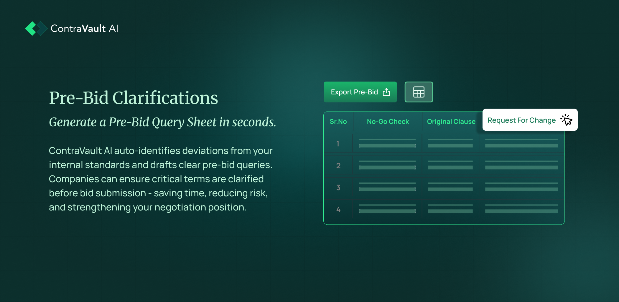 • Pre-Bid Clarifications generator that drafts precise, referenced questions for procuring entities.