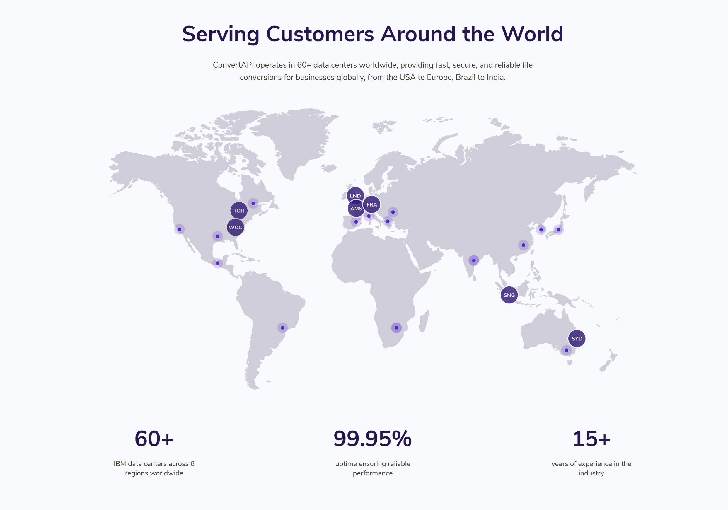 Whether you’re building a product, processing thousands of files per day, or need secure, scalable document handling, ConvertAPI delivers with low latency, enterprise-grade uptime (99.95% SLA), and full compliance (ISO 27001, GDPR, HIPAA).