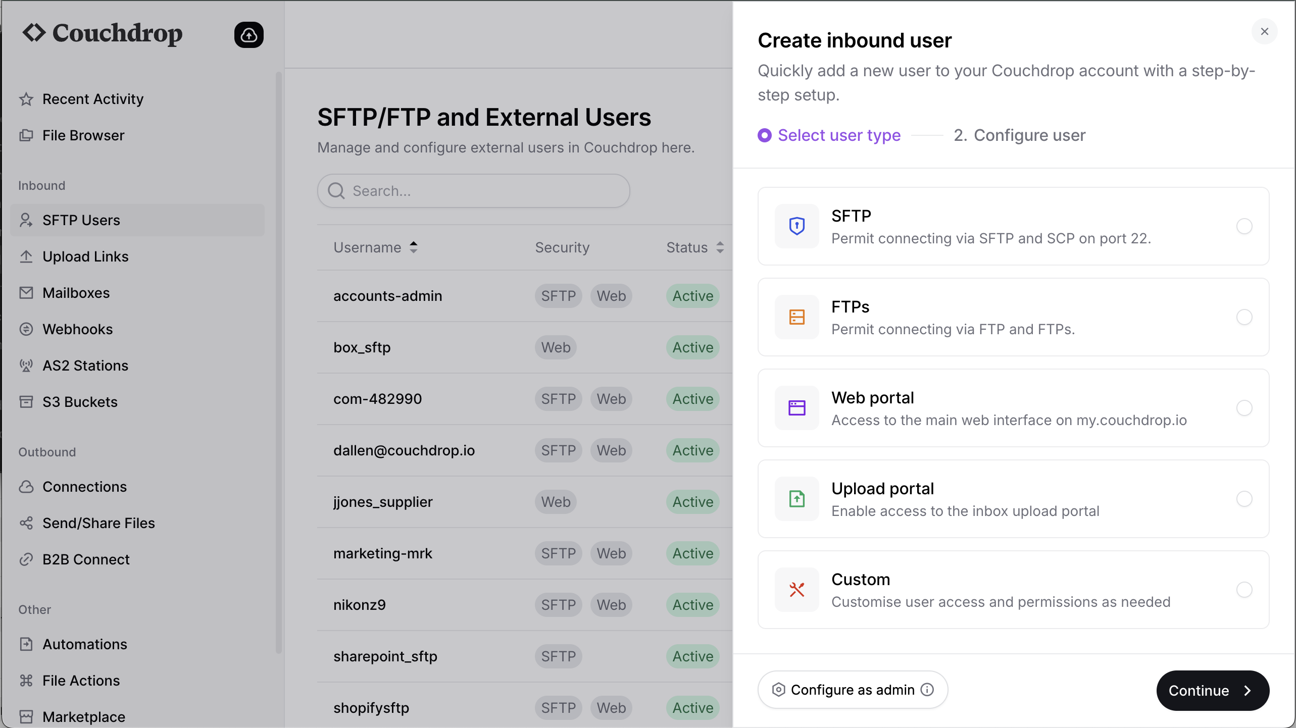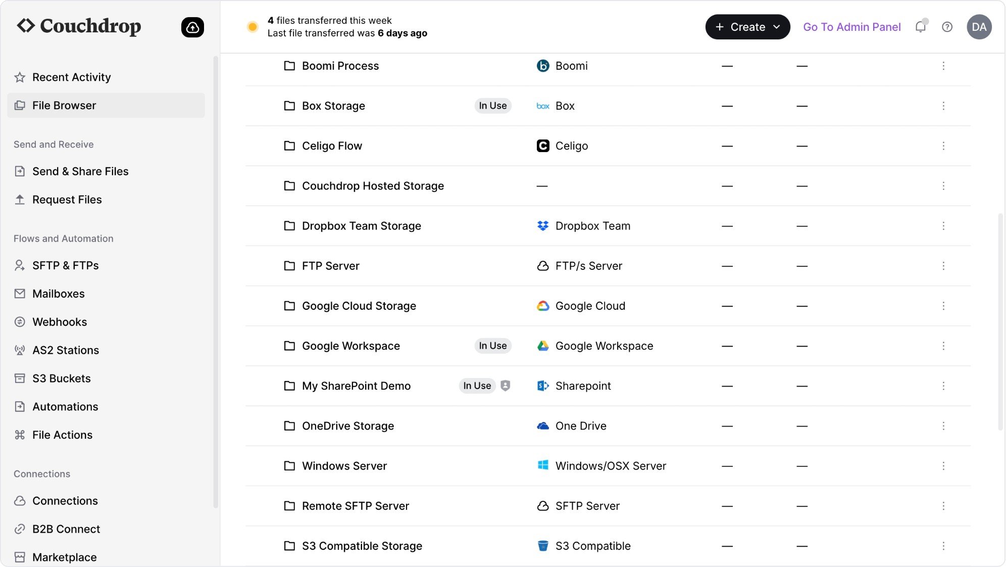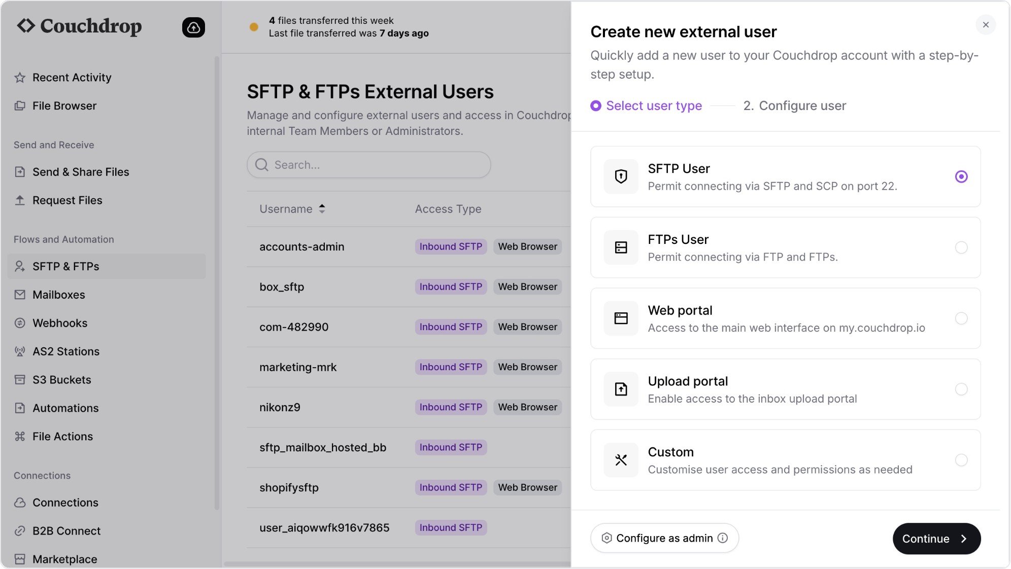 Couchdrop aims to be simple and easy enough for anyone to use. An SFTP server is created immediately at sign-up, and all admin and management tasks are done through a modern, uncomplicated web interface where users can connect platforms, add external users, and build workflows using the no-code automation builder.