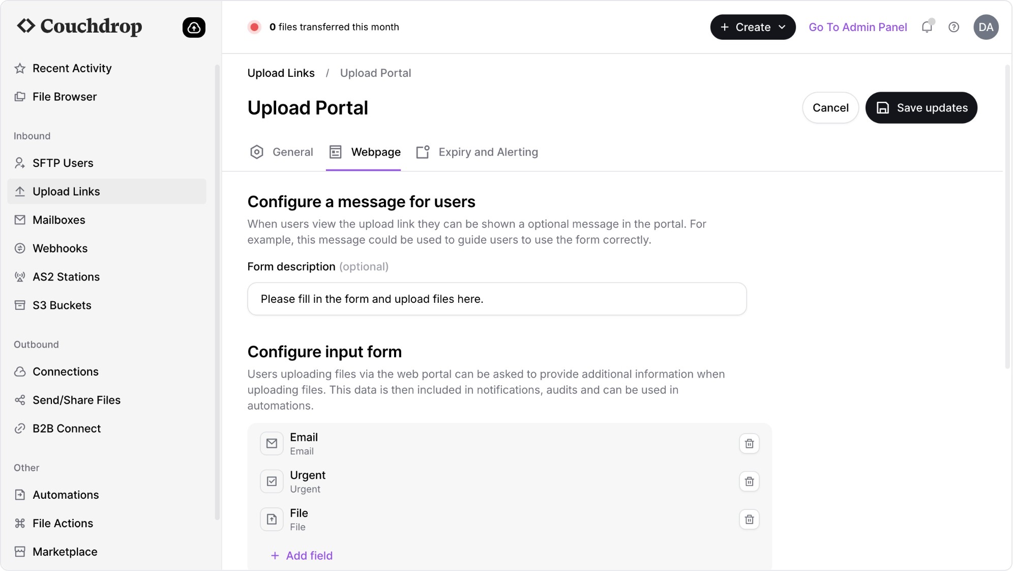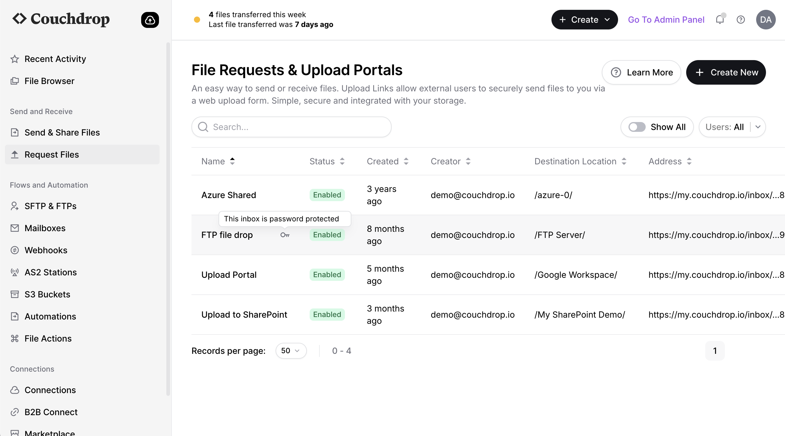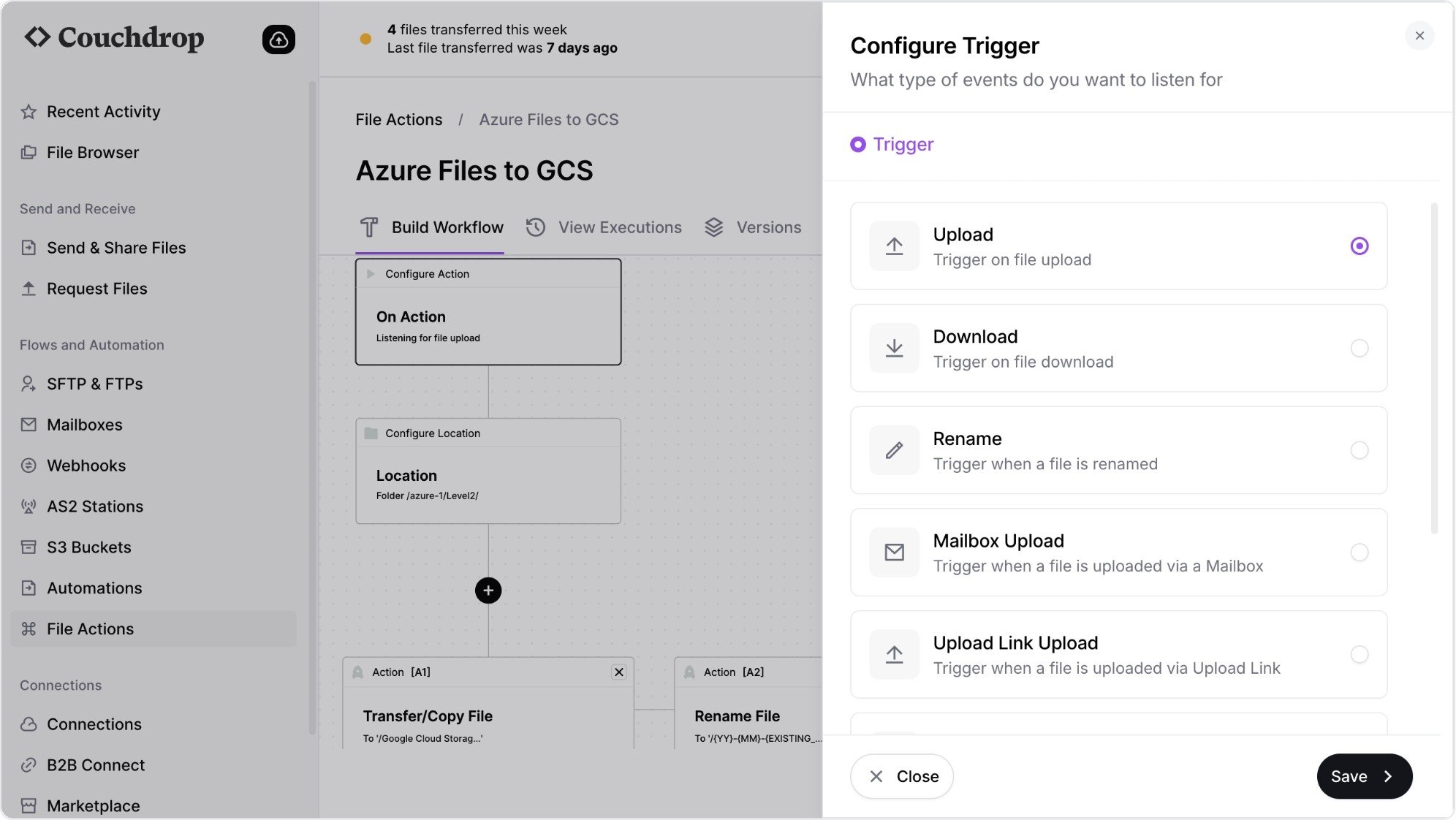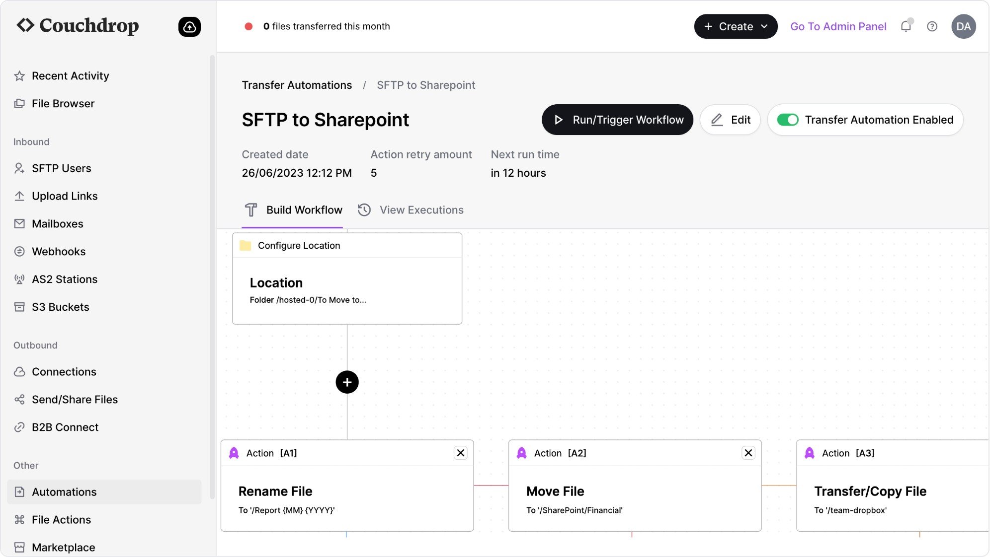 Couchdrop aims to be simple and easy enough for anyone to use. An SFTP server is created immediately at sign-up, and all admin and management tasks are done through a modern, uncomplicated web interface where users can connect platforms, add external users, and build workflows using the no-code automation builder.
