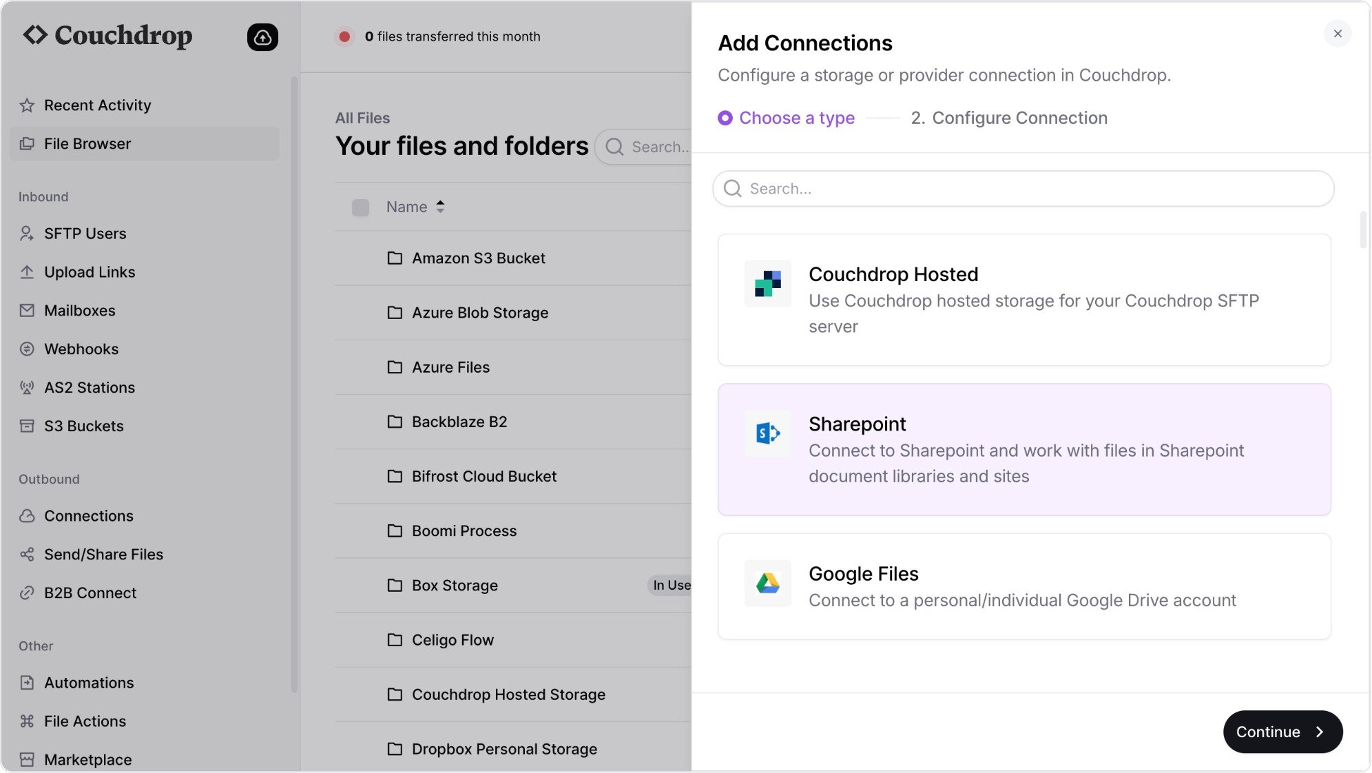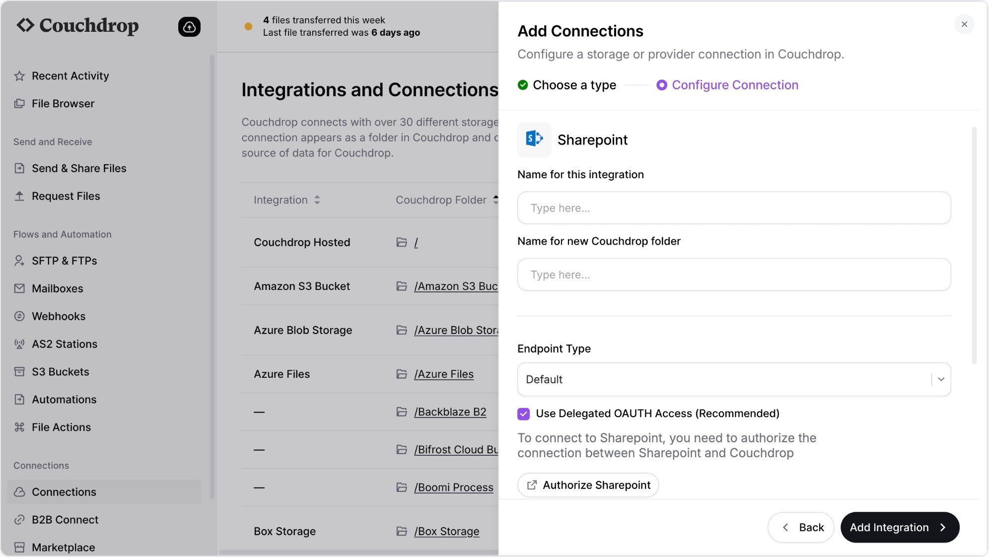 Supporting, simple, direct connections to storage like SharePoint, Dropbox, Azure, and more, Couchdrop integrates with over 20 platforms and growing. Couchdrop does not store data at any stage of the process and acts as a secure pipe between systems, leaving you in full control at all times.