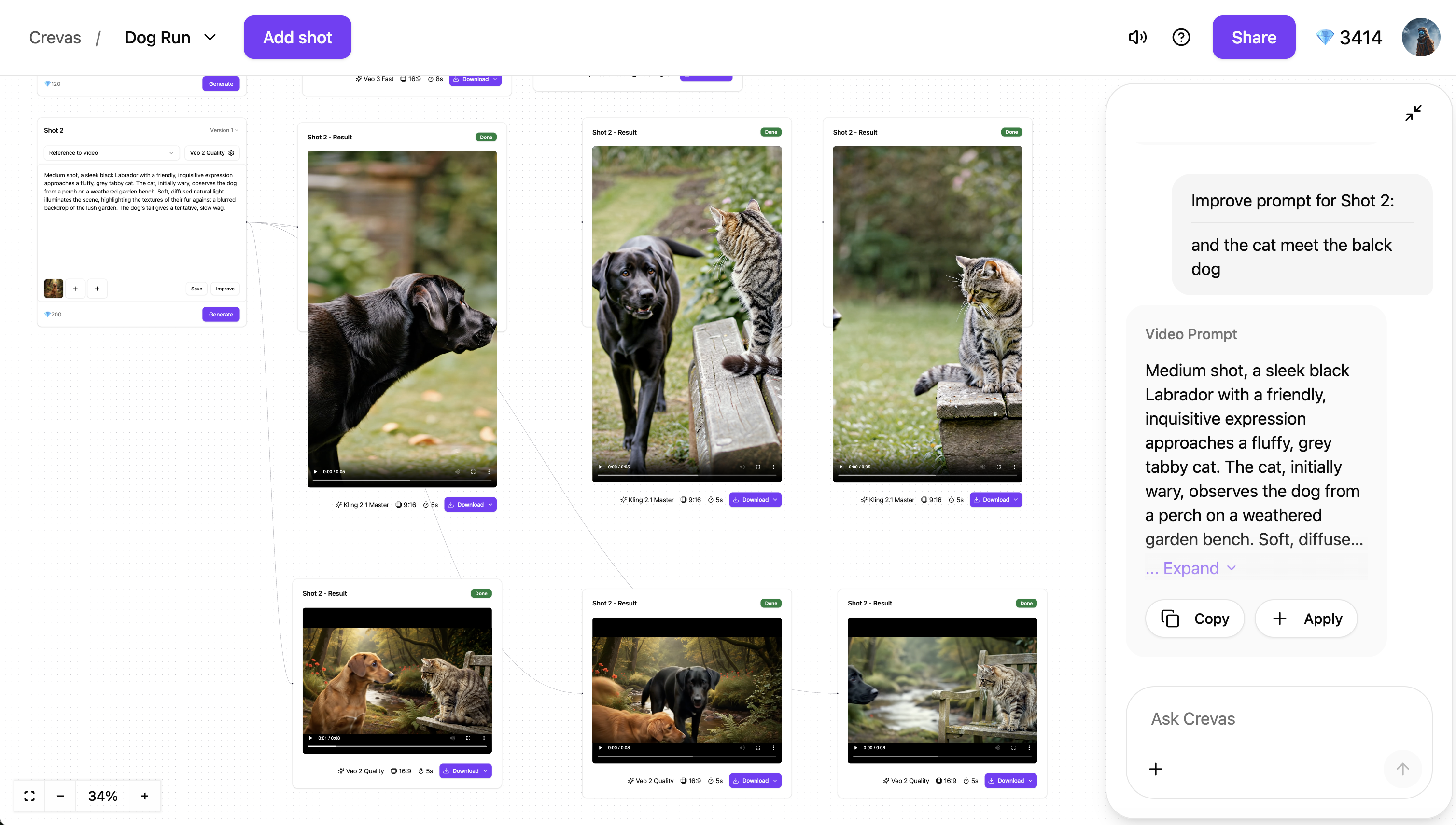 Crevas AI Demo - Generate Veo3 Videos in canvas with AI-chat
