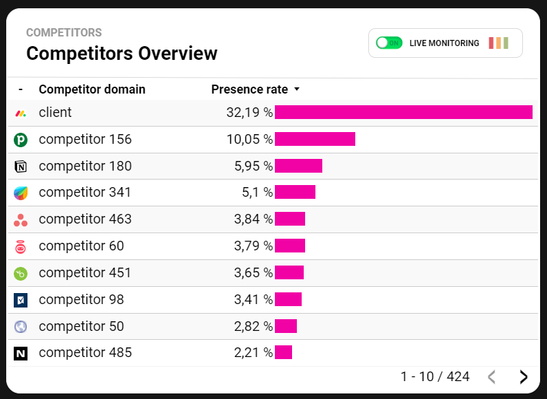 SE Ranking is a robust SEO toolkit that best suits small to mid-sized agencies and in-house teams. It combines unique datasets with advanced features to help SEO pros build and implement effective strategies. SE Ranking covers keyword and competitive research, on-page, off-page and tech optimization, content creation, local SEO and more. Teams can benefit from automated reporting, WL, and the extra user seats included in most subscription plans. SE Ranking’s pricing policy is generous and flexible.