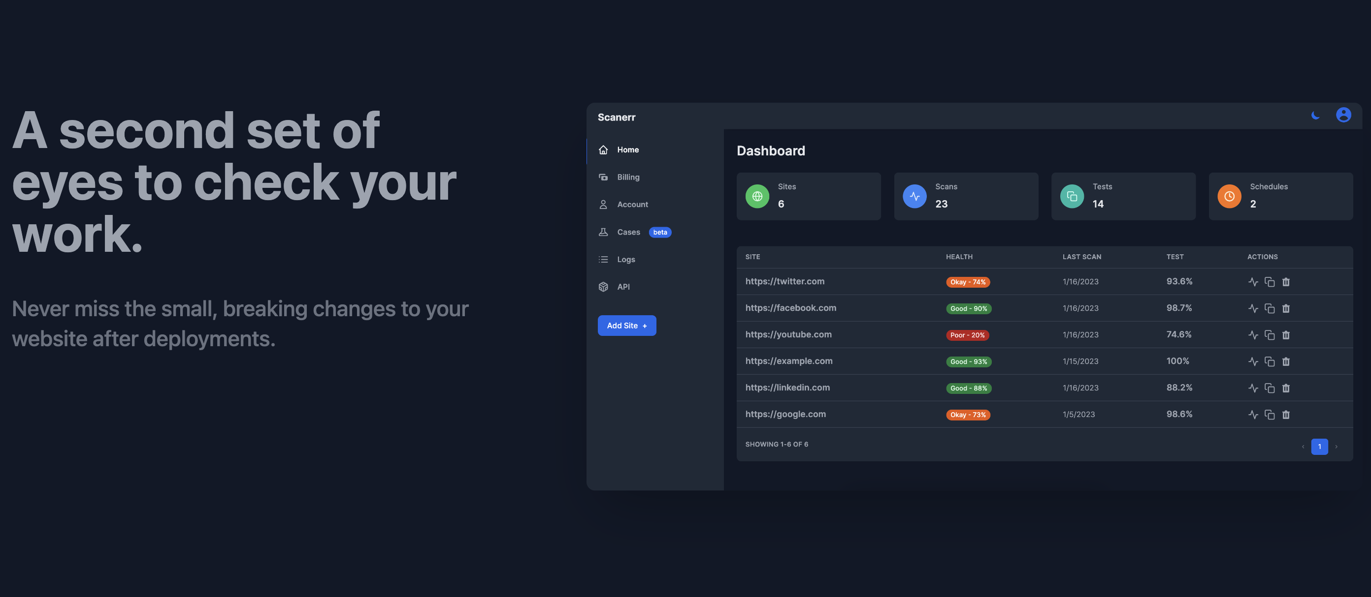 What stands out most about Scanerr is its user-friendly interface and comprehensive monitoring capabilities. The intuitive design makes it easy for users of all levels to navigate, while its robust features provide thorough insights into website health and performance. Additionally, the automation feature streamlines tasks and saves valuable time. Overall, Scanerr's combination of usability and functionality makes it a top choice for website monitoring. Review collected by and hosted on G2.com.