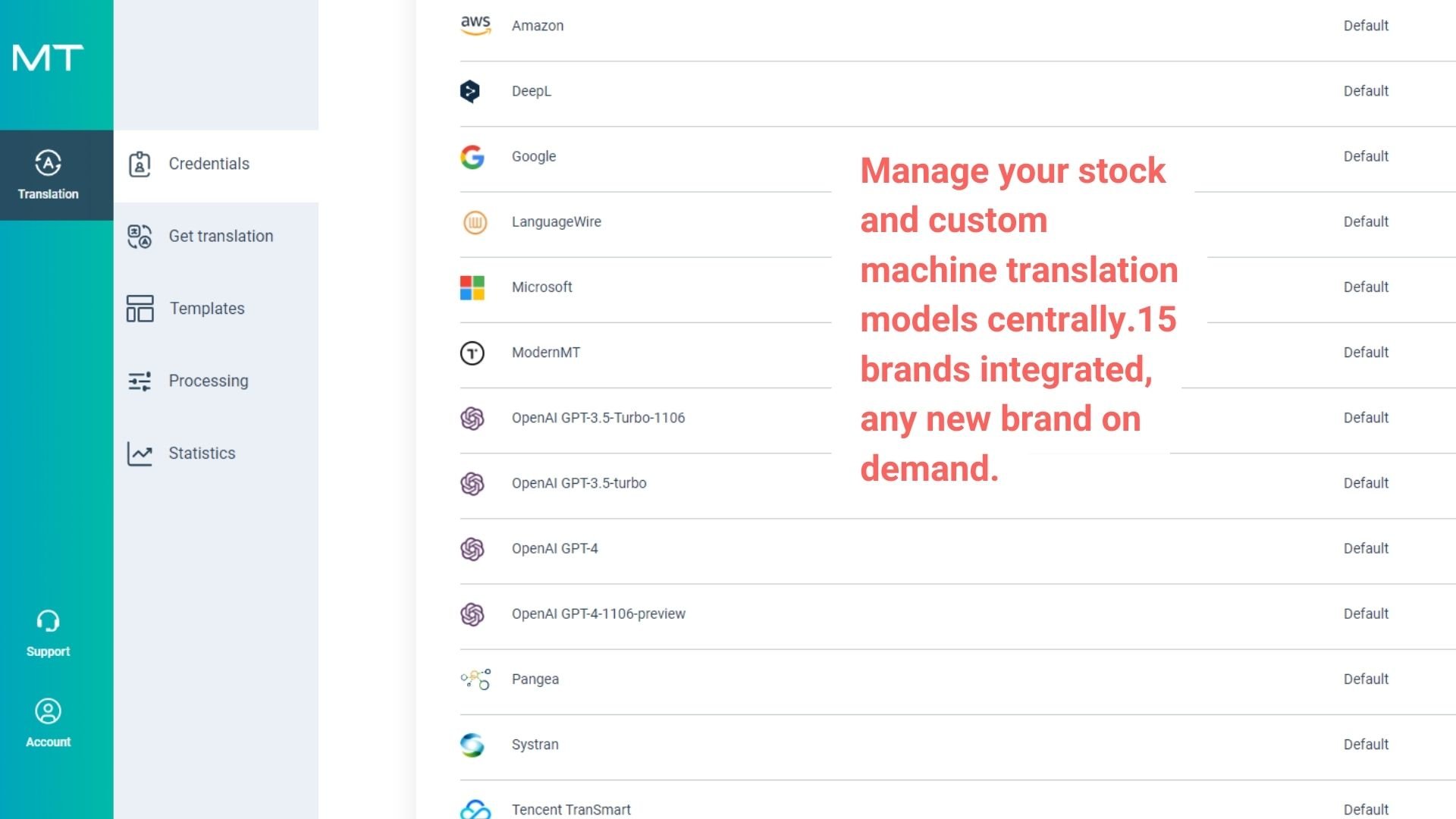 Custom.MT is a Machine Translation Console that gives access to 15+ machine translation engines, including ChatGPT.