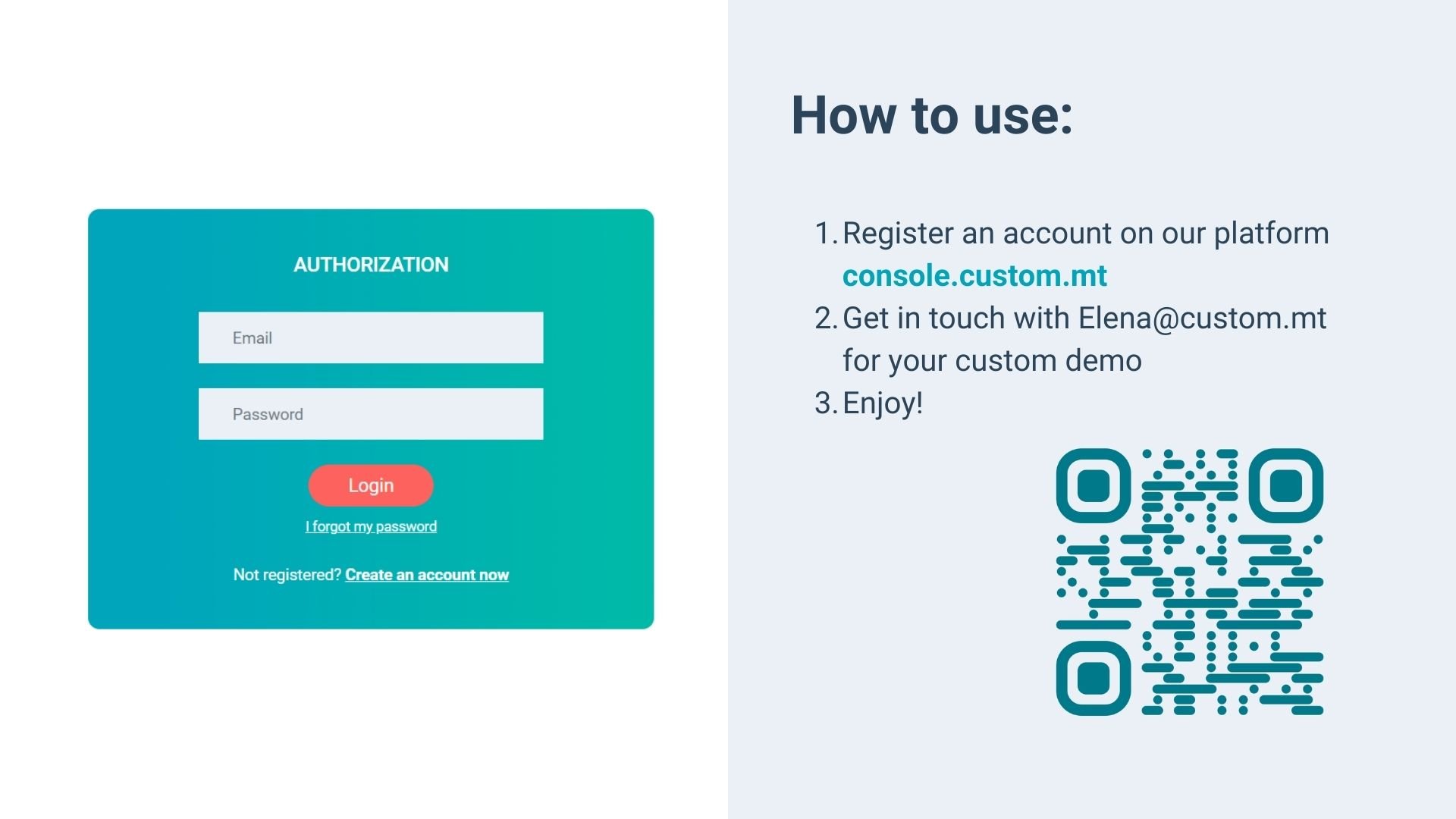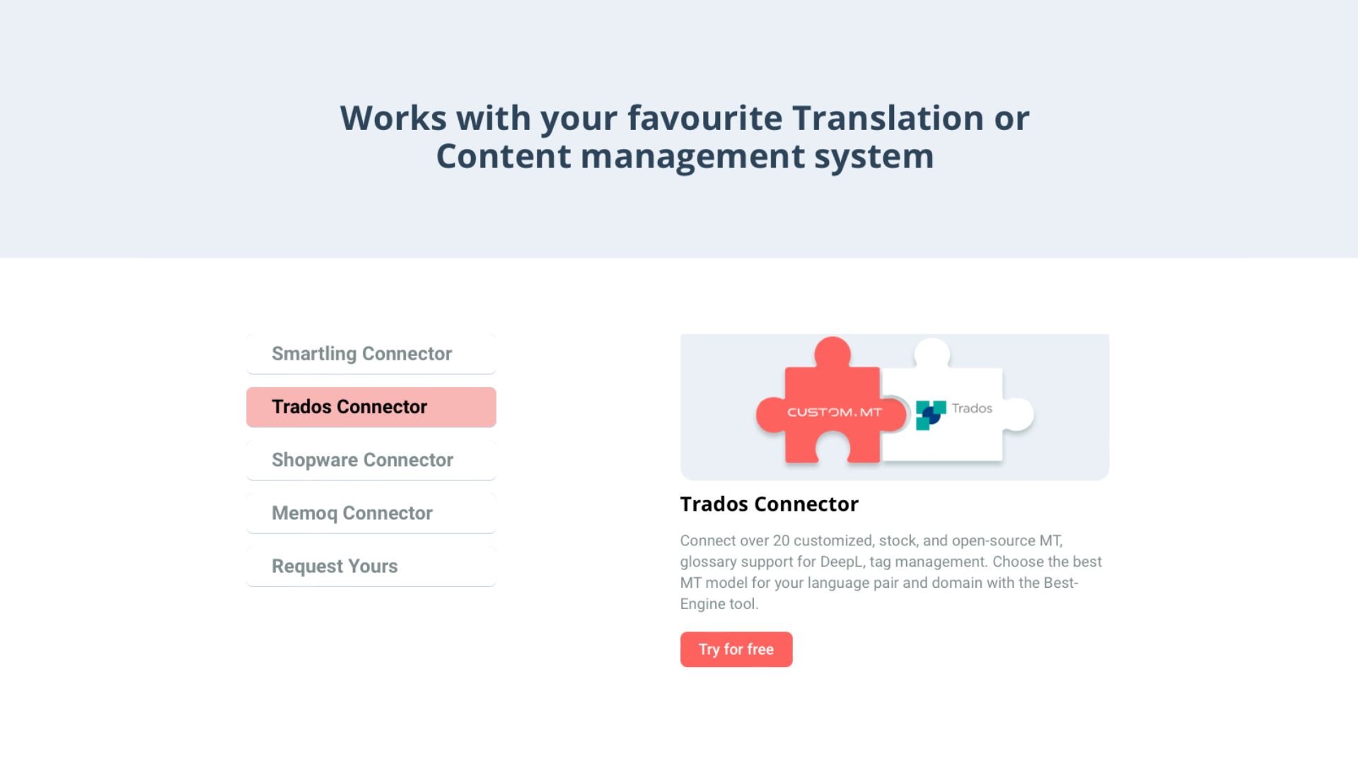 Our premier offering, the Custom.MT Console, stands as a comprehensive machine translation management system. It seamlessly integrates with leading localization tools such as Trados, memoQ, Smartling, Shopware, and Blackbird, offering a streamlined workflow.